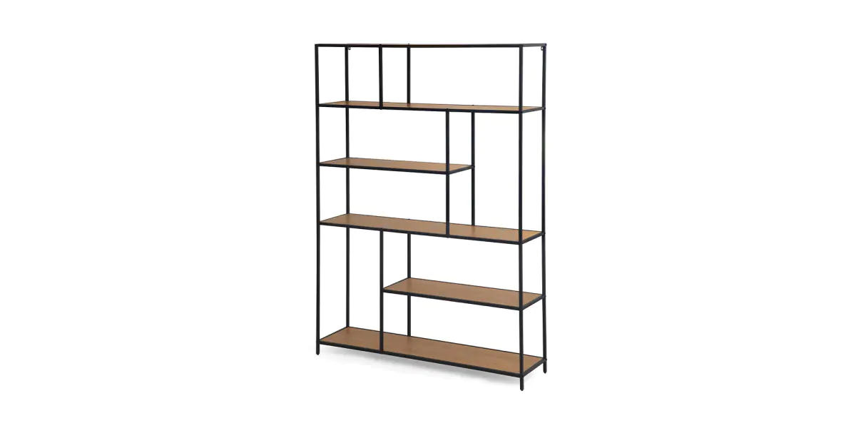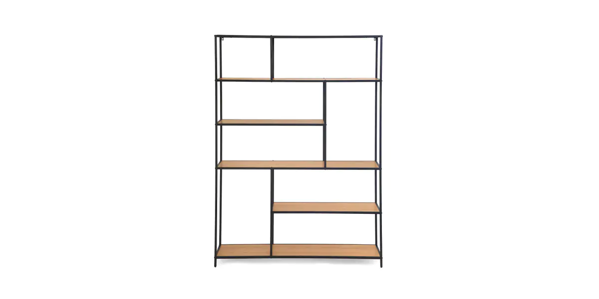 Díky asymetrickému rozložení polic působí zajímavě a zároveň poskytuje místo pro knihy, dekorace nebo doplňky.