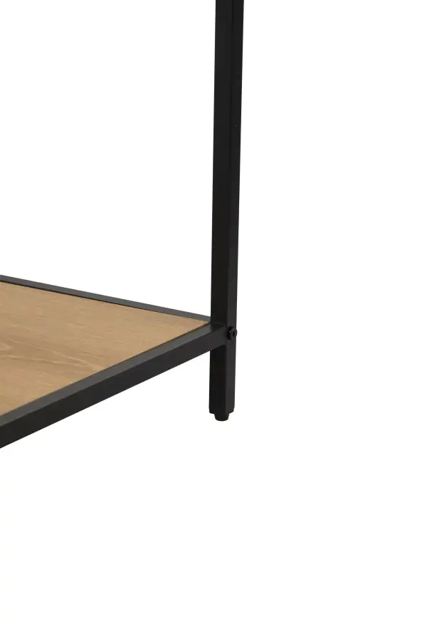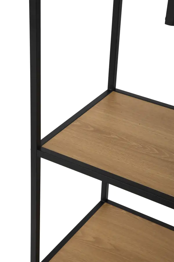 Černá kovová konstrukce zajišťuje stabilitu, zatímco laminované police jsou snadno udržovatelné a odolné vůči běžnému používání.