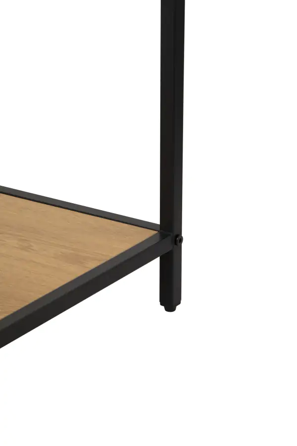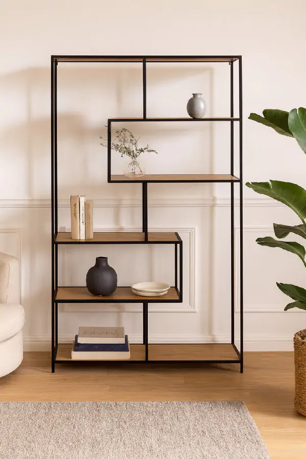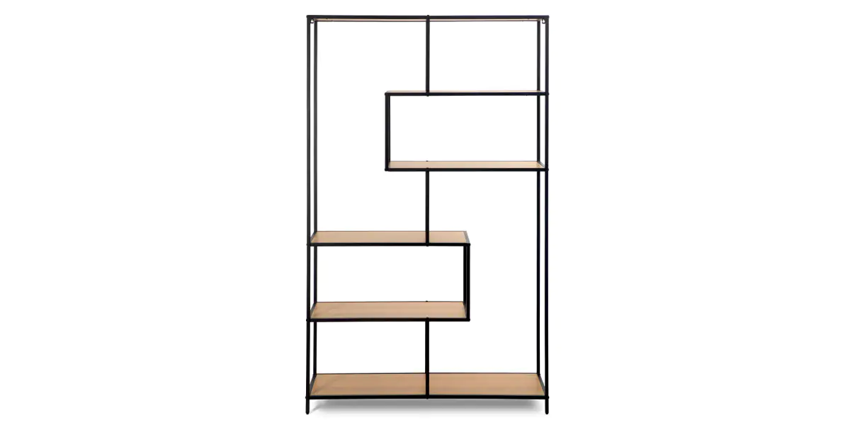 Díky asymetrickému rozložení polic působí zajímavě a zároveň poskytuje místo pro knihy, dekorace nebo doplňky. Černá kovová konstrukce zajišťuje stabilitu, zatímco laminované police jsou snadno udržovatelné a odolné vůči běžnému používání.