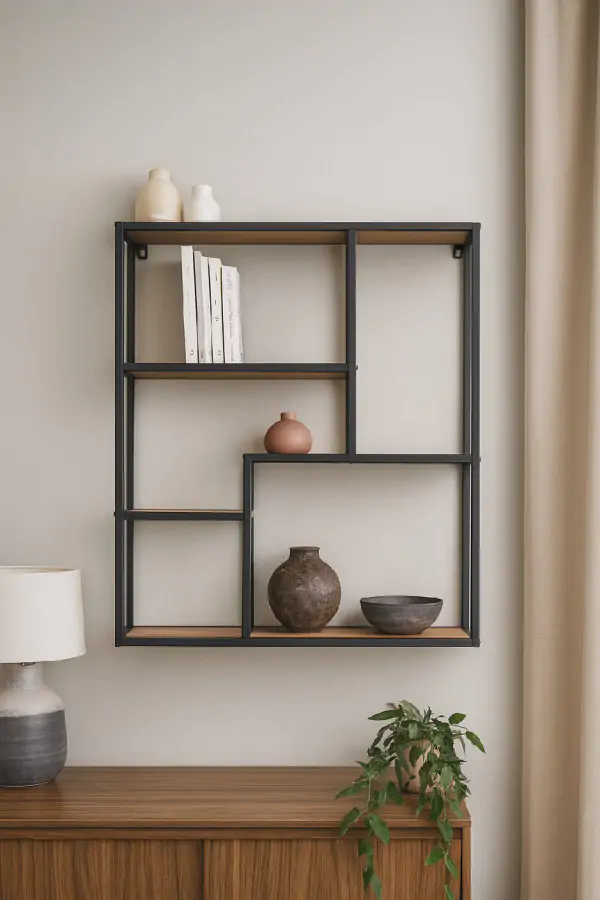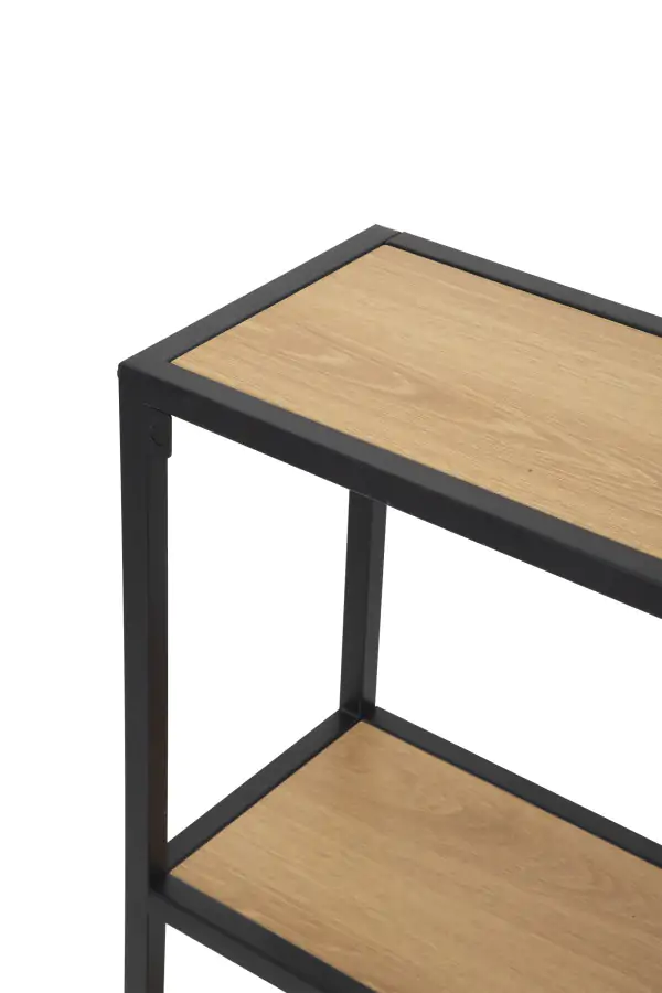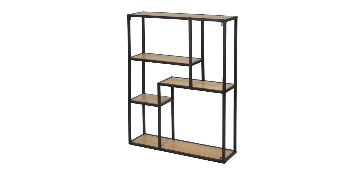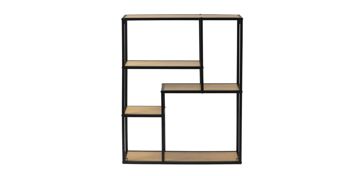 Díky asymetrickému rozložení polic působí zajímavě a zároveň poskytuje místo pro knihy, dekorace nebo doplňky. Černá kovová konstrukce zajišťuje stabilitu, zatímco laminované police jsou snadno udržovatelné a odolné vůči běžnému používání.