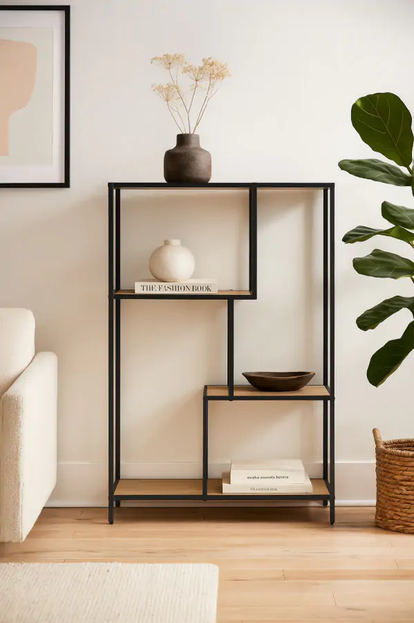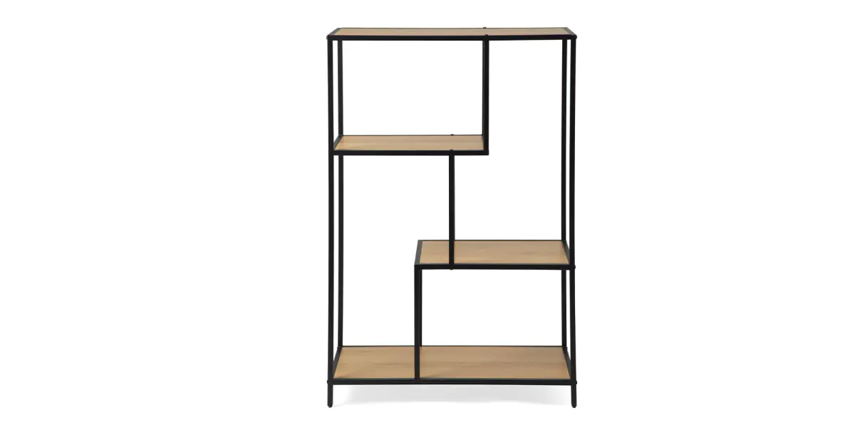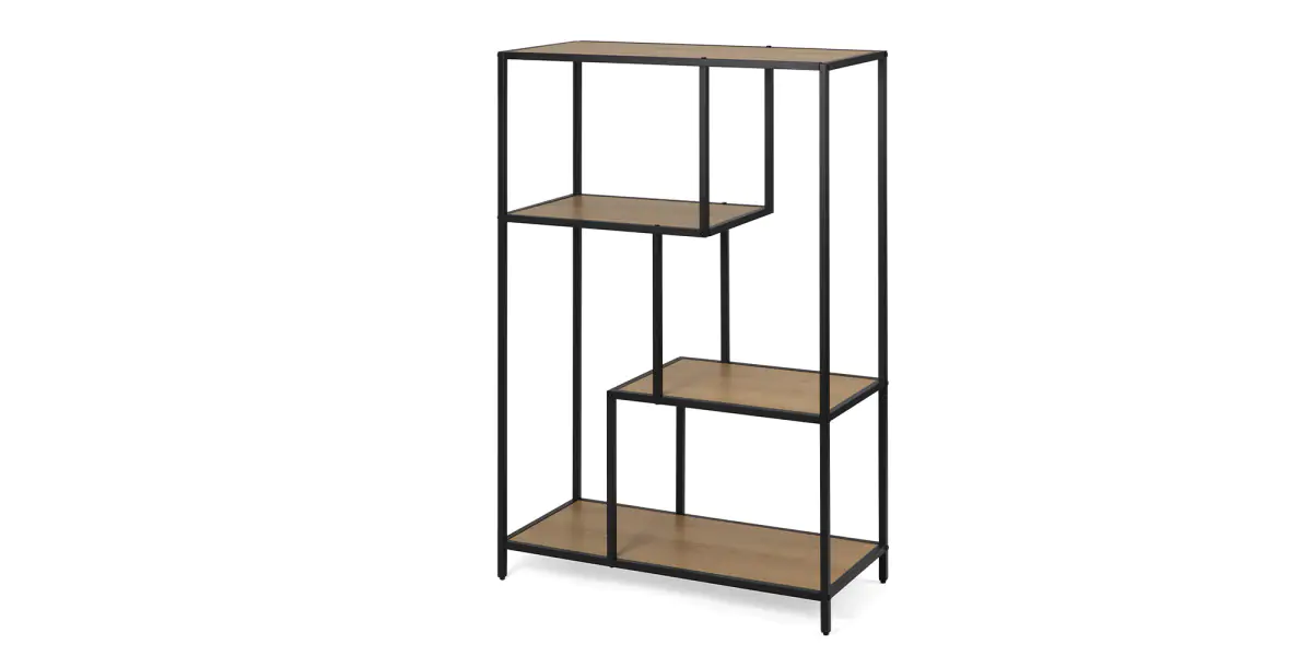 Díky asymetrickému rozložení polic působí zajímavě a zároveň poskytuje místo pro knihy, dekorace nebo doplňky.