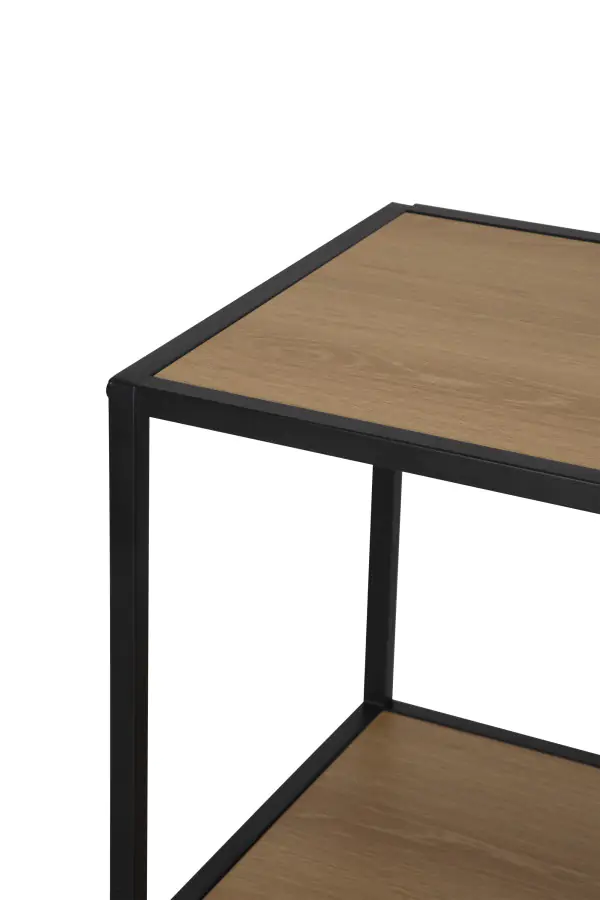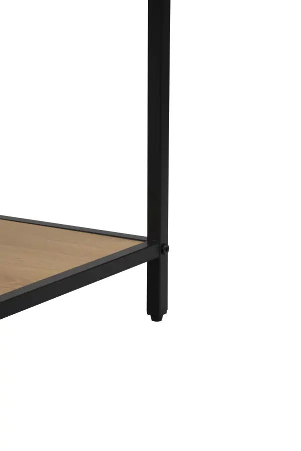 Černá kovová konstrukce zajišťuje stabilitu, zatímco laminované police jsou snadno udržovatelné a odolné vůči běžnému používání.