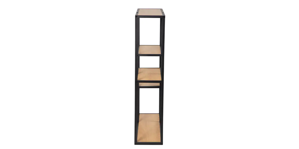 Praktický otevřený regál ARCANA s kovovým rámem a policemi z MDF v dekoru přírodního dřeva nabízí funkční úložný prostor s odlehčeným vzhledem.