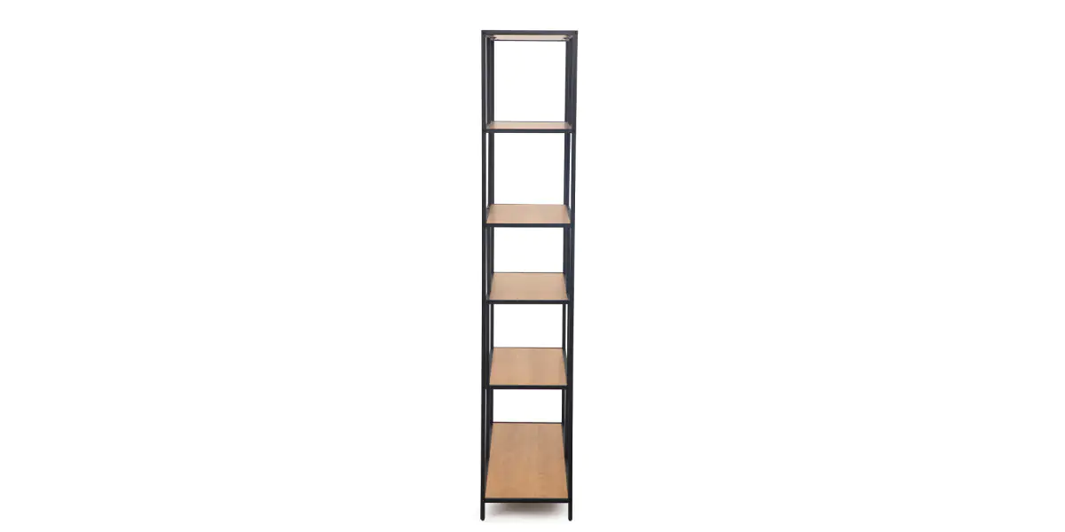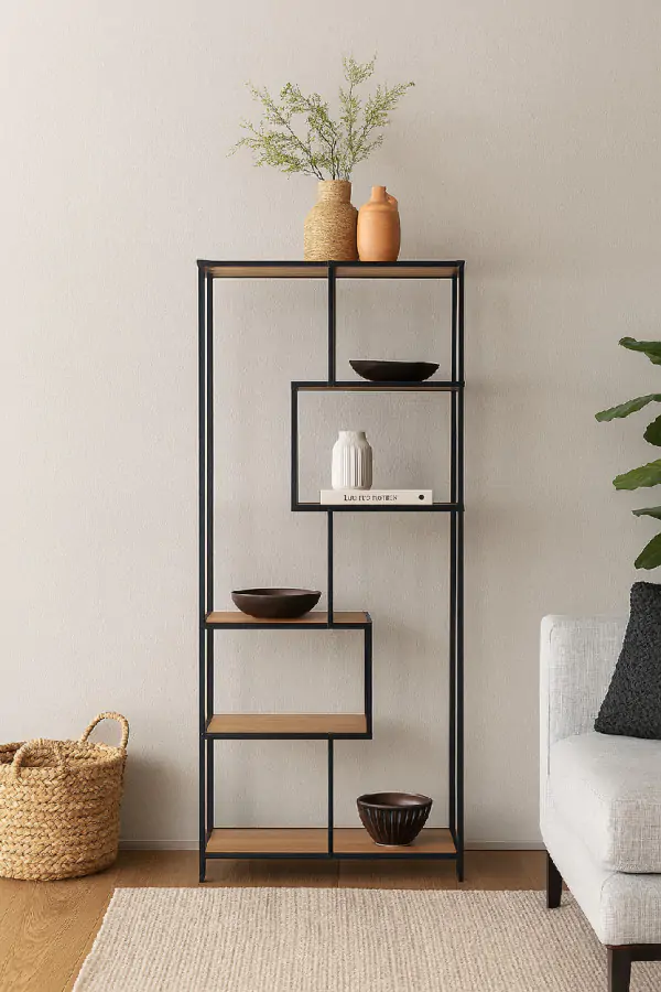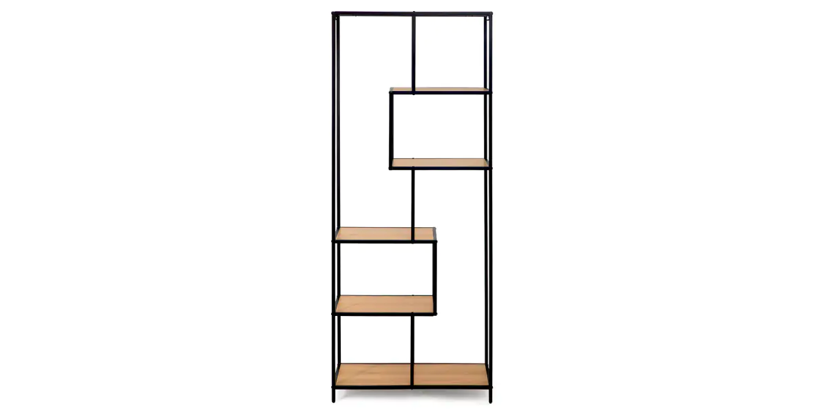Díky asymetrickému rozložení polic působí zajímavě a zároveň poskytuje místo pro knihy, dekorace nebo doplňky. Černá kovová konstrukce zajišťuje stabilitu, zatímco laminované police jsou snadno udržovatelné a odolné vůči běžnému používání.