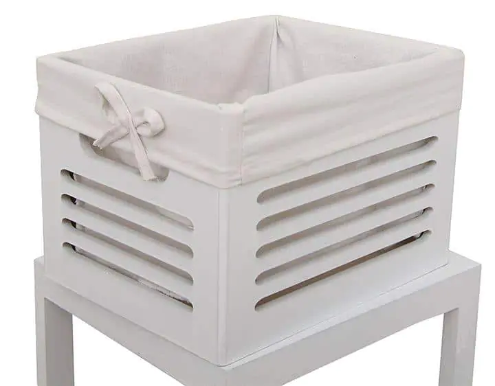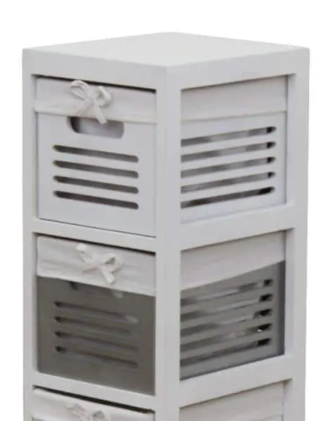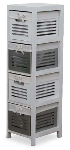 4 zásuvková dřevěná komoda s pevným rámem je vybavena košíky v kombinaci šedé a bílé barvy.