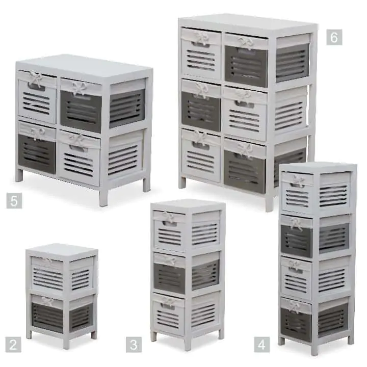 Provedení: 4 zásuvková dřevěná komoda s pevným rámem je vybavena košíky v kombinaci šedé a bílé barvy. Doporučujeme kombinovat s dalšími produkty z řady BIBI (viz související). Dodáváno v demontu.