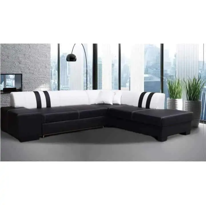 Rohová sedací souprava Peter New je vyrobena v moderní černo-bílé kombinaci s designovými pruhy.