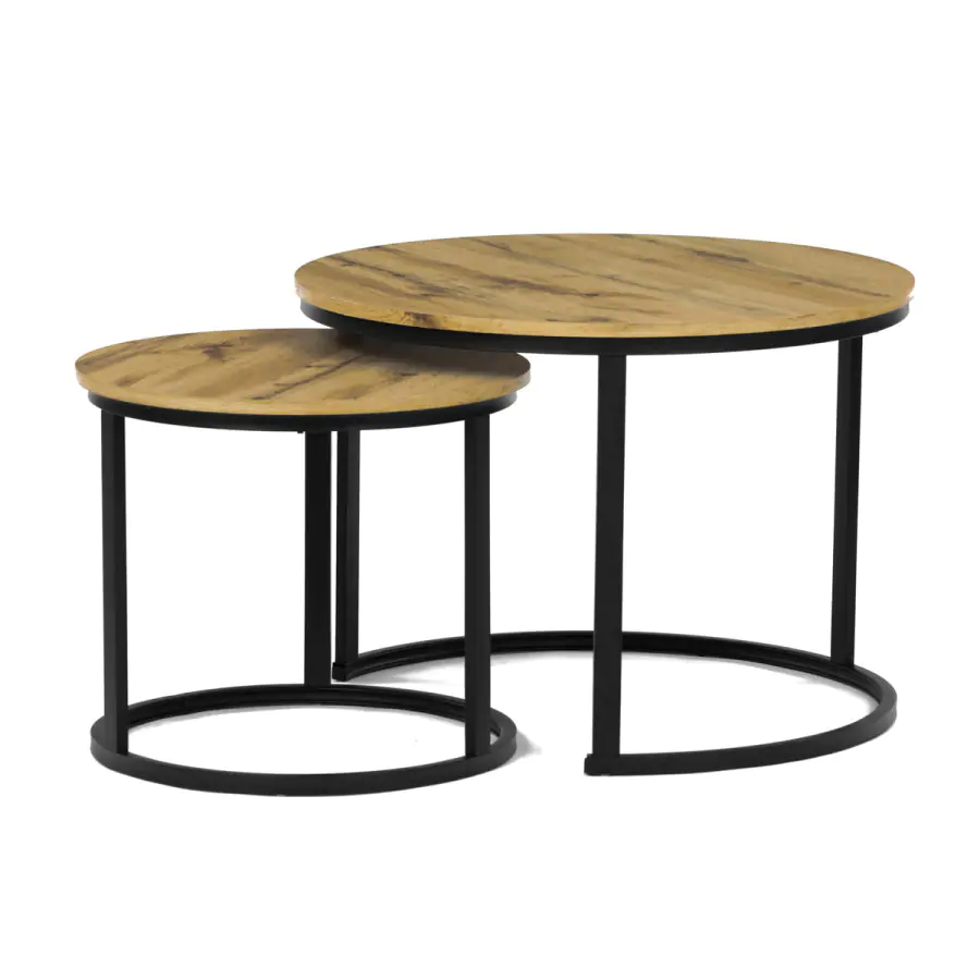 Konferenční stoly CT-X7122 OAK v setu dvou kusů kombinují desky z MDF s dekorem divokého dubu a pevnou kovovou podnož v černém matném laku.