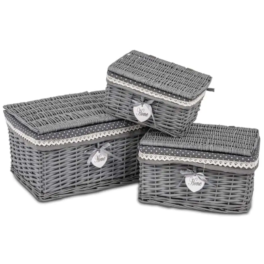 Sada 3 proutěných košíku s vrchním víkem bude nejen ideálním pomocníkem pro uschování věcí, ale i hezkou interiérovou dekorací! Každý z košíku má uvnitř světle šedou látkou zdobenou bílými puntíky...