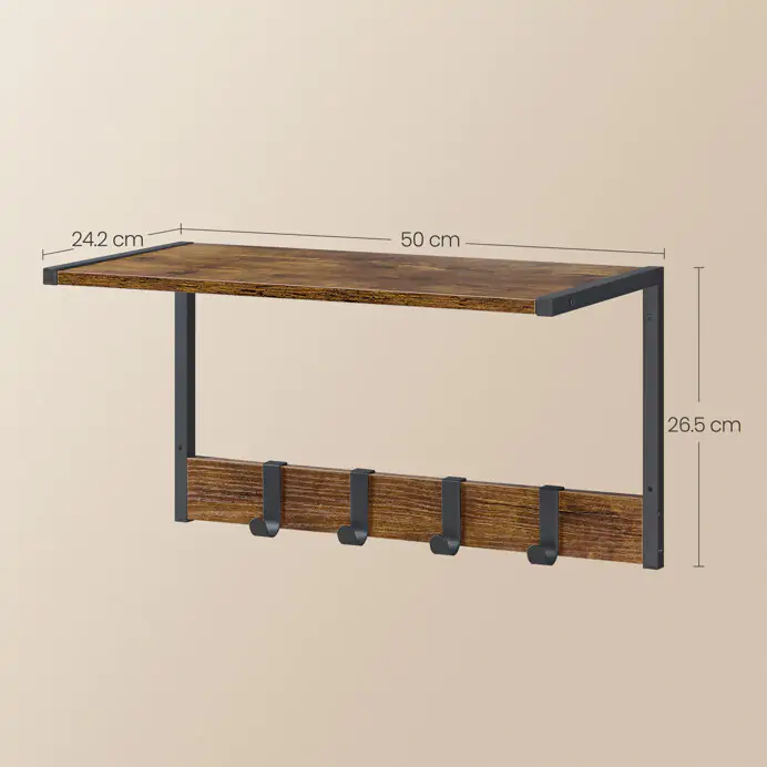 Police nabízejí praktický odkládací prostor a jsou doplněny o čtyři kovové háčky na každé polici, vhodné pro zavěšení klíčů, drobných doplňků nebo kuchyňského náčiní. Povrch desek je upraven v odstínech přírodního dřeva, což přispívá k příjemné atmosféře interiéru.