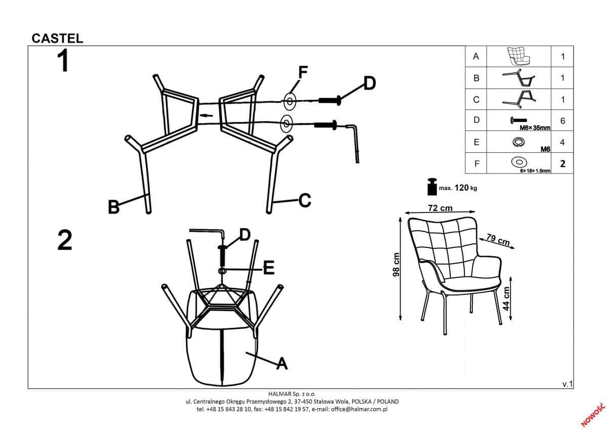 Moderní křeslo Castel 2 je čalouněné tmavě zelenou potahovou látkou, je zdobeno prošívaným opěrákem. Nohy jsou z chromované ocele ve zlaté barvě. Nosnost křesla je 120 kg. Dodáváno v demontu.