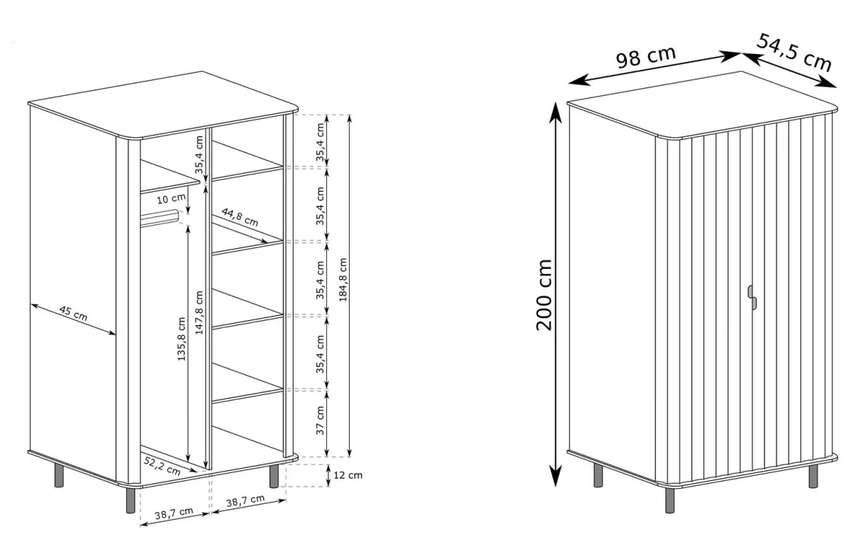 Díky dvou skříňkám s vnitřními policemi a šatní tyčí budete mít ve věcech konečně pořádek. Kvalitní výsuvy (soft close) a panty s tichým dovíráním se postarají o každodenní komfort. Rozměry viz obrázek.