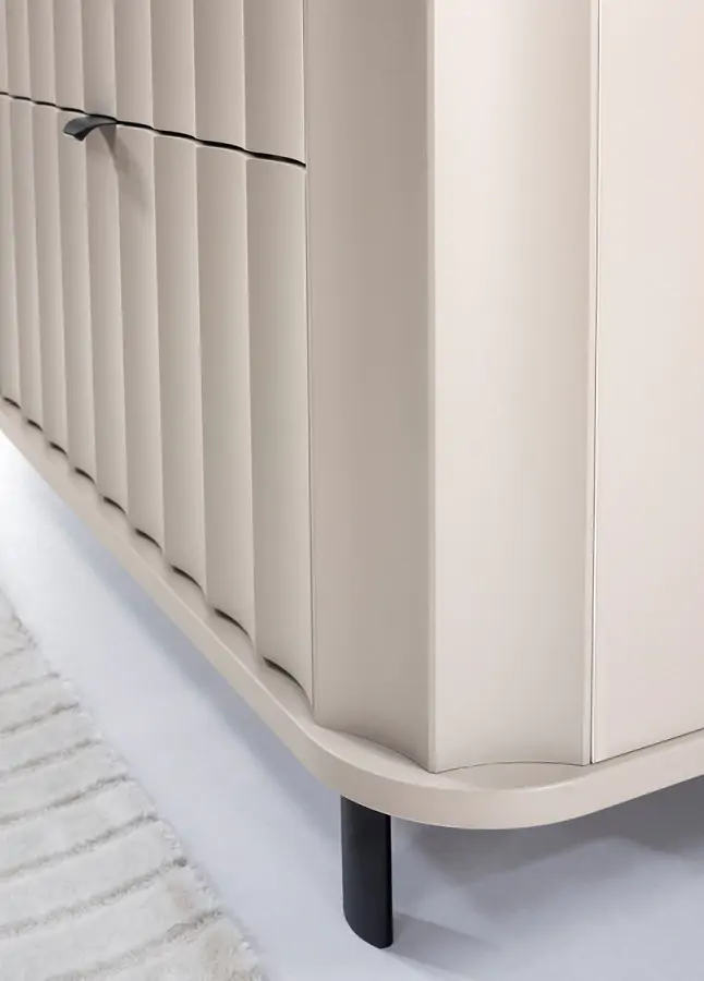 Skříň podepírají štíhlé kovové ocelové nožky práškově lakované o výšce 12 cm, které zajišťují nejen stabilitu, ale i lehkost vzhledu a snadnější úklid pod nábytkem. Jsou to kusy nábytku, které se nestylizují násilně, ale spíše podtrhují charakter prostoru.