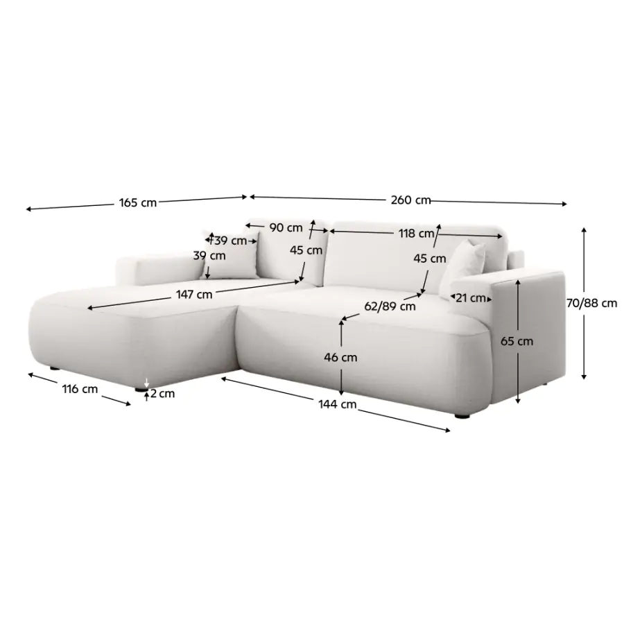 - Rozměry (ŠxHxV): 260x165x70/88 cm