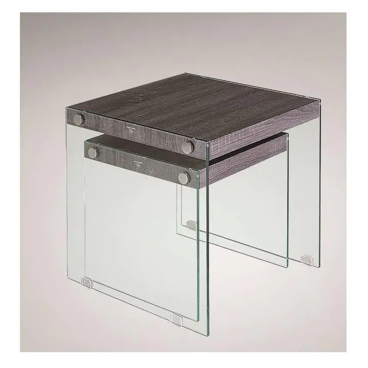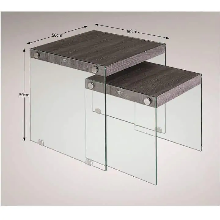 Set obsahuje dva odkládací stolky, které jsou vyrobené z MDF v dekoru dřeva a tvrzeného skla.