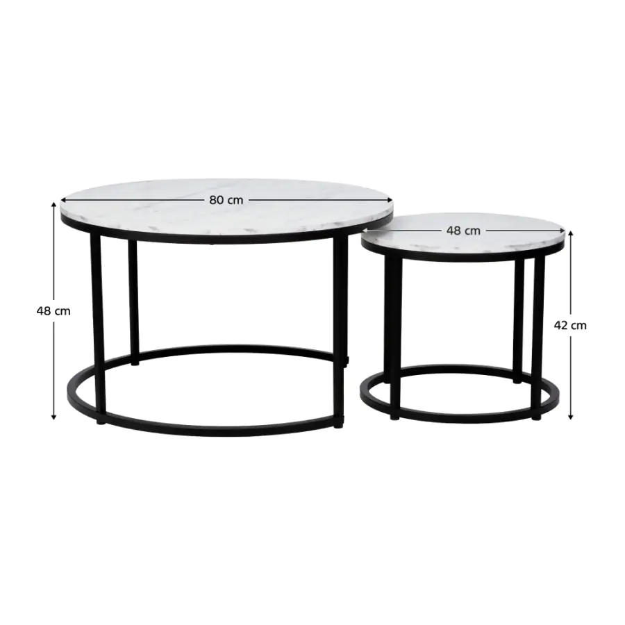 Tento minimalistický a přece designový set konferenčních stolků CIRKO si najde uplatnění v každém interiéru a nabídne dostatek místa i při větší návštěvě. Set se skládá z dvou kulatých stolků. Kombinace černé kovové konstrukce a vrchní desky z DTD laminovaná v dekoru bílého mramoru působí moderně a nadčasově.
