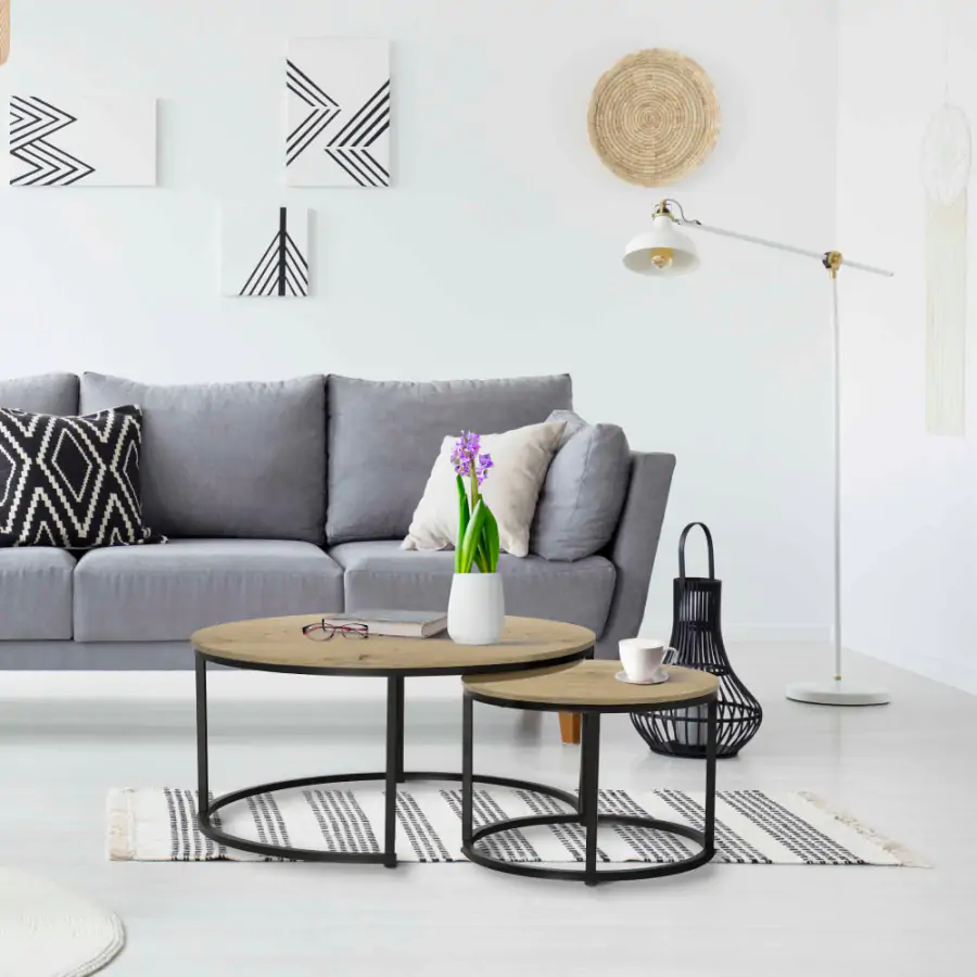 Tento minimalistický a přece designový set konferenčních stolků CIRKO si najde uplatnění v každém interiéru a nabídne dostatek místa i při větší návštěvě. Set se skládá z dvou kulatých stolků. Kombinace černé kovové konstrukce a vrchní desky z DTD laminovaná v dekoru dubu působí moderně a nadčasově.