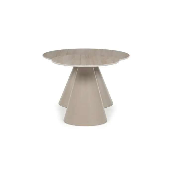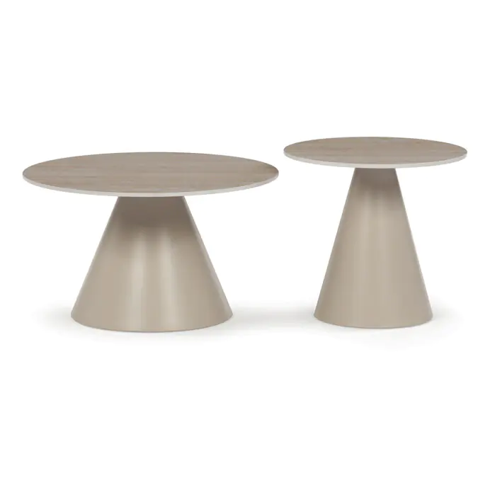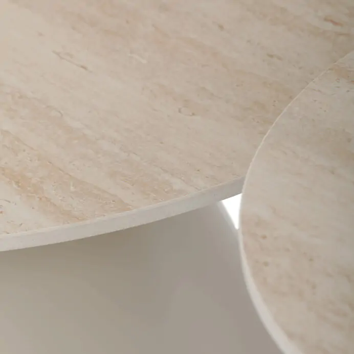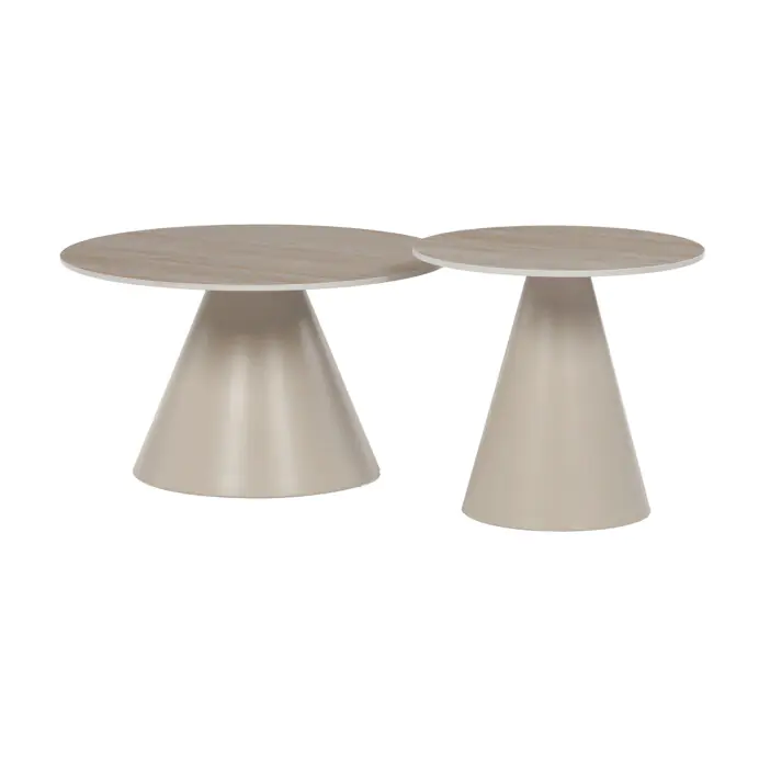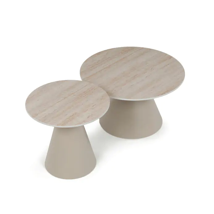 Větší stůl má průměr 70 cm a výšku 40,5 cm, menší pak průměr 50 cm a výšku 47 cm, což umožňuje variabilní uspořádání v prostoru. Keramická deska je navržena pro snadnou údržbu a odolnost vůči běžnému opotřebení, zatímco pevná kovová podnož zajišťuje stabilitu a dlouhou životnost.
