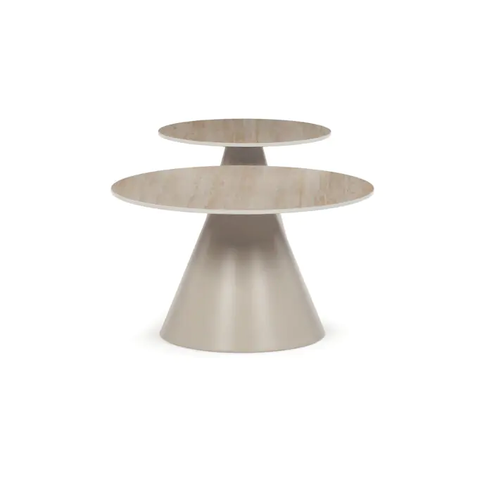 Sada konferenčních stolů CT-F4118 TRV v moderním stylu kombinuje keramické desky s dekorem travertinu a stabilní kovové podnože v béžovém matném provedení . Větší stůl má průměr 70 cm a výšku 40,5...