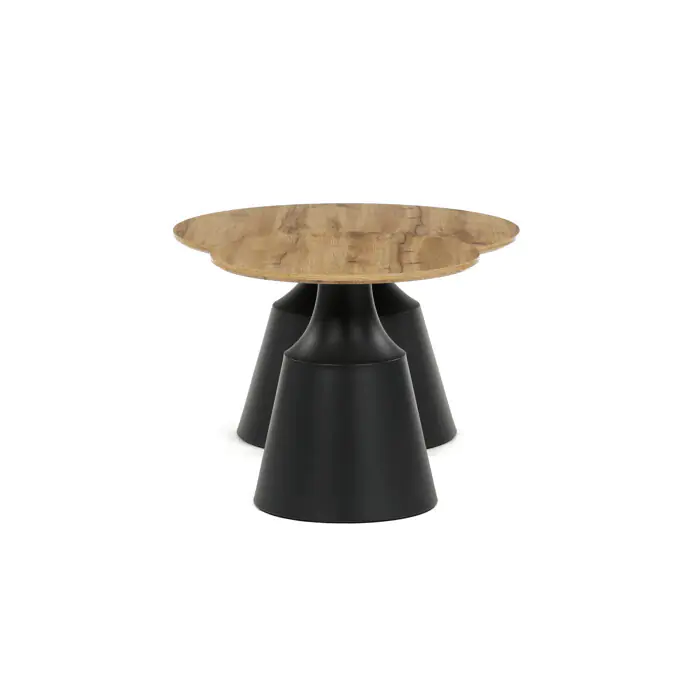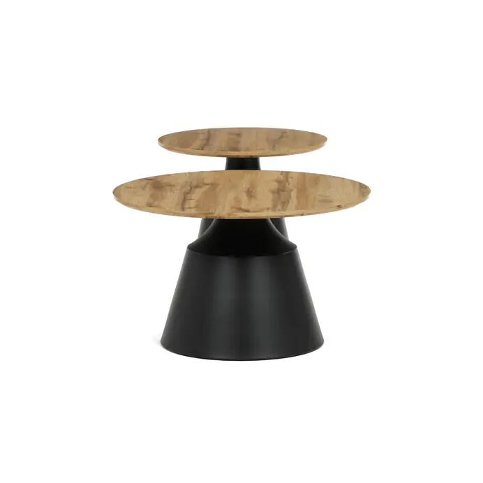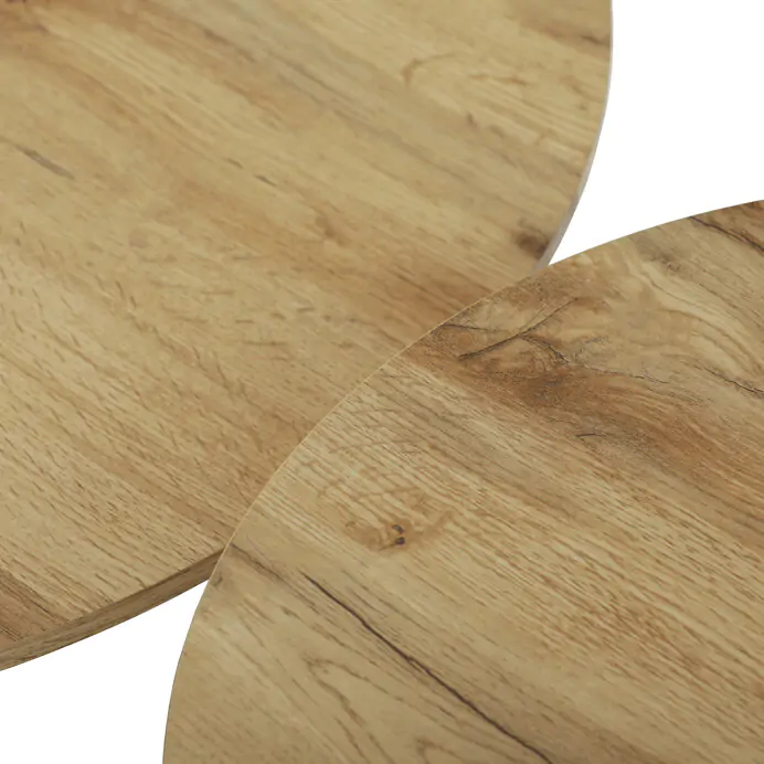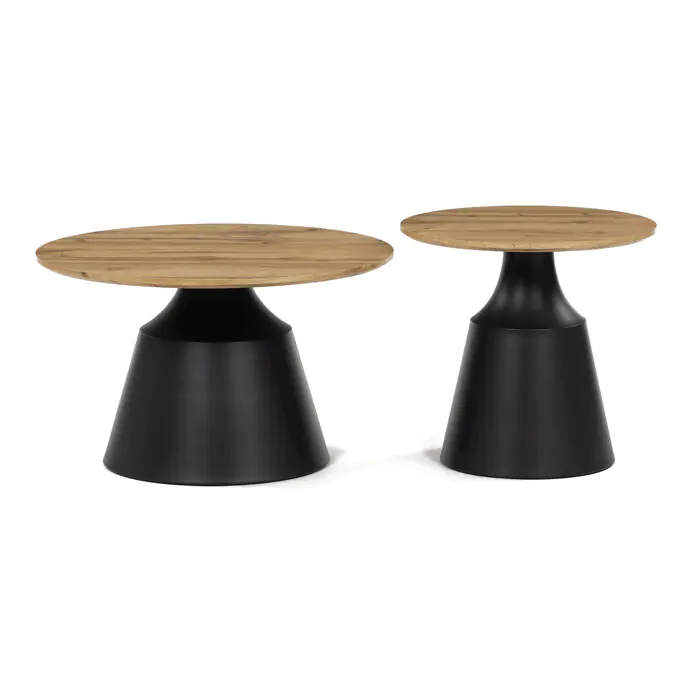 Větší stůl má průměr 70 cm a výšku 42,5 cm, menší pak průměr 50 cm a výšku 47,5 cm, což umožňuje variabilní uspořádání v prostoru. Kovová podnož je navržena pro pevnost a stabilitu, čímž zajišťuje bezpečné používání. Moderní design s kontrastem přírodního dekoru a černé barvy se hodí do různých interiérů.