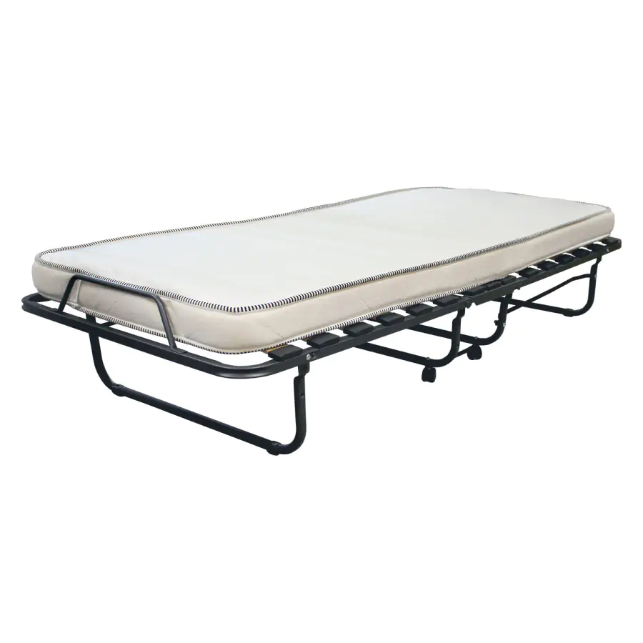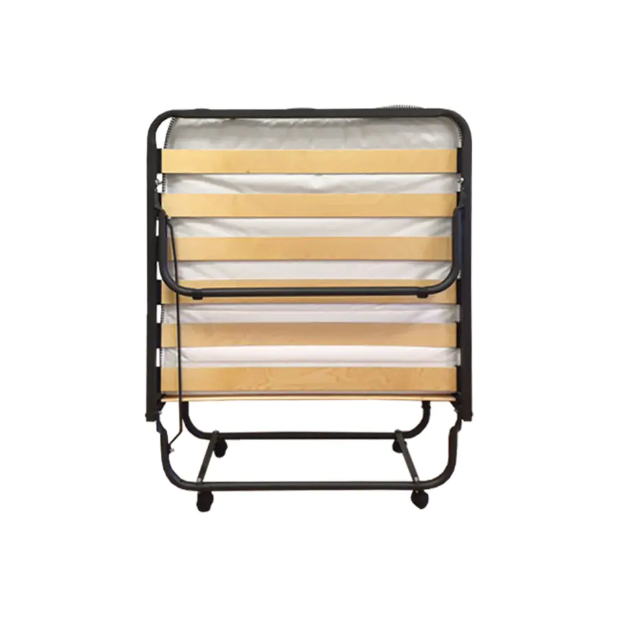 Skládací postel má trubkový rám, pevnost a komfort zajišťuje 15 dřevěných lišt.