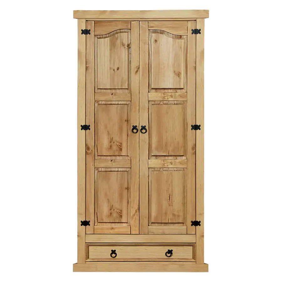 Dvoudveřová šatní skříň z masivní borovice, voskovaná v medovém odstínu. Šatní skříň je vybavena šatní tyčí a policí na klobouky, ve spodní části je velká zásuvka. Skříň má stylové kovové ozdobné úchytky.