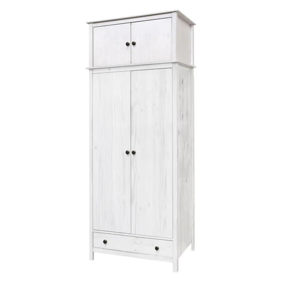 Kombinace masivní borovice, elegantního bílého laku a kovových úchytek dělá z této skříně stylový a funkční doplněk do jakéhokoli interiéru. Ideální do ložnice, obývacího pokoje nebo chodby, kde nejen zkrášlí prostor, ale také poskytne praktické úložné řešení.