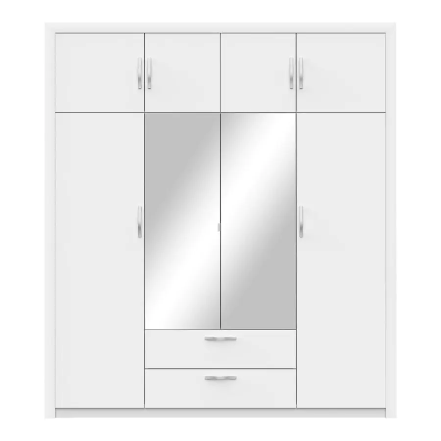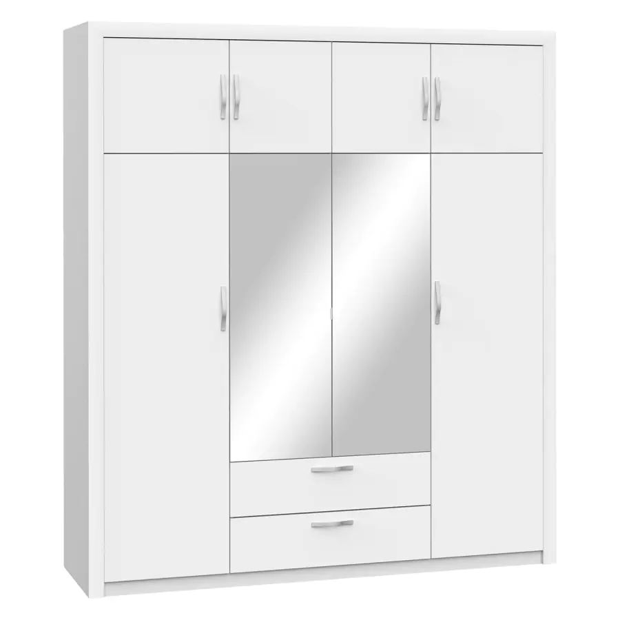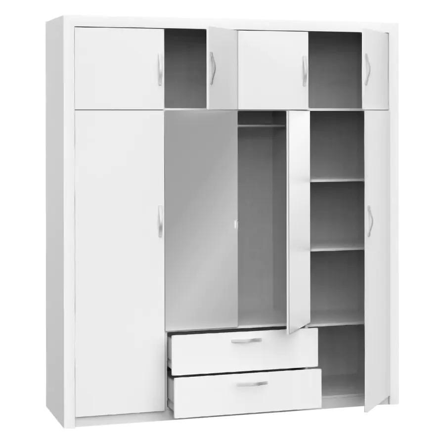 Čtyřdveřová šatní tyč je zhotovena z laminované dřevotřísky v barevném provedení perleťově bílá. Prostor je dělený v poměru 1:2:1, nástavec rozdělený na 2 stejné části je součástí skříně v každé užší části 3 police z toho 2 variabilní.