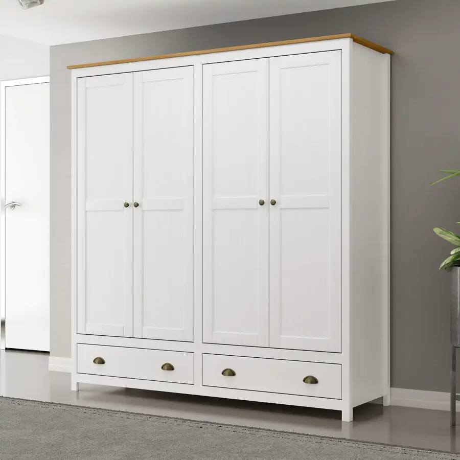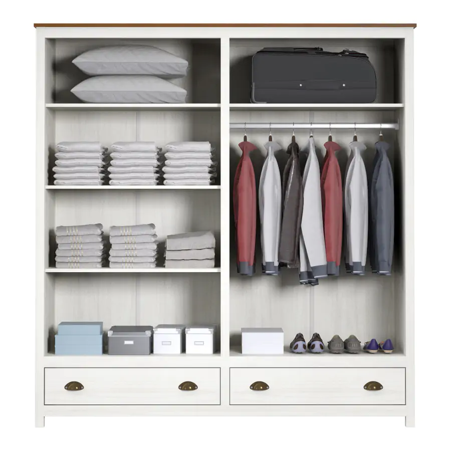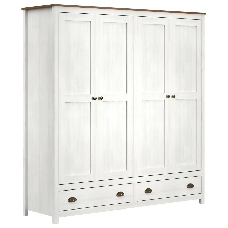 Šatní skříň je vyrobena z z masivního borovicového dřeva v v barevném provedení bílý/hnědý lak. Za otočnými dveřmi naleznete šatní tyč a polici. Ve spodní části skříně se nacházejí dvě zásuvky s kovovými úchytkami a pojezdy.