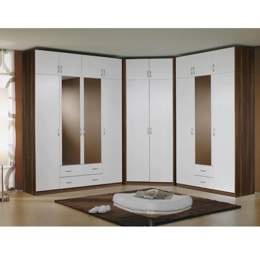 Třídveřová šatní skříň se zrcadlem v barevném provedení ořech / bílá je zhotovena z laminované dřevotřísky.