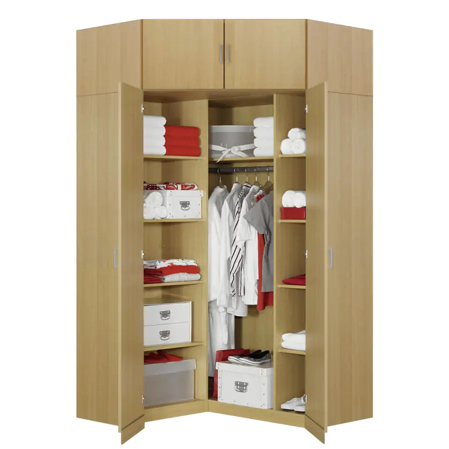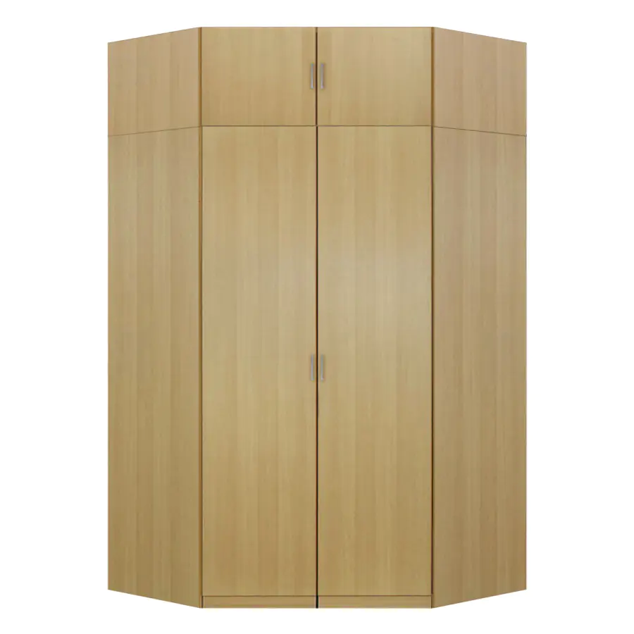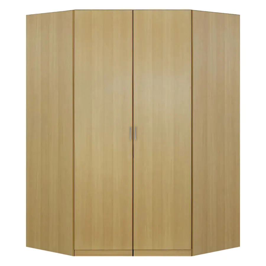 Rohová šatní skříň v barevném provedení buk je vyrobena z laminované dřevotřísky.