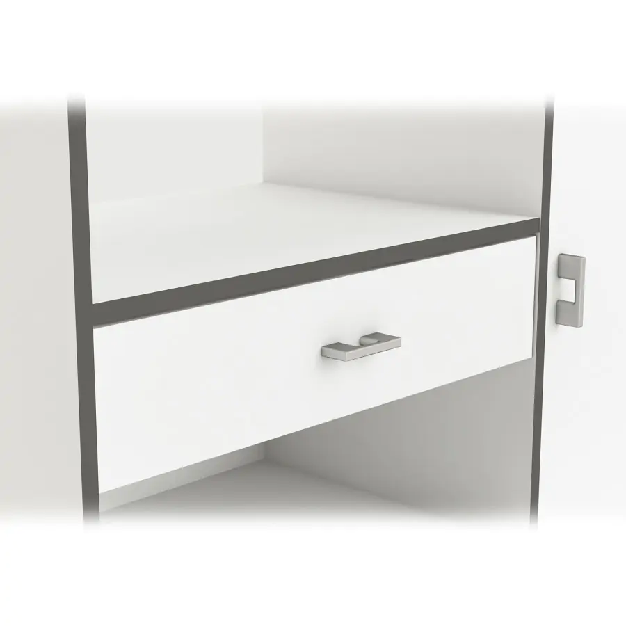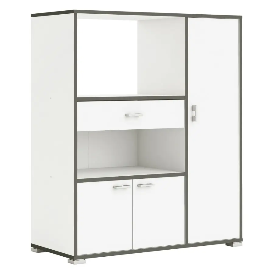 Jedna zásuvka s kovovými pojezdy, rozměr zásuvky (š/h/v) 52 × 33 × 7 cm, prostor pro mikrovlnnou troubu o rozměru (š/h/v) 56 × 40 × 35 cm, dlouhá dvířka se 2 variabilními policemi, otevřená police a 2 menší dvířka.