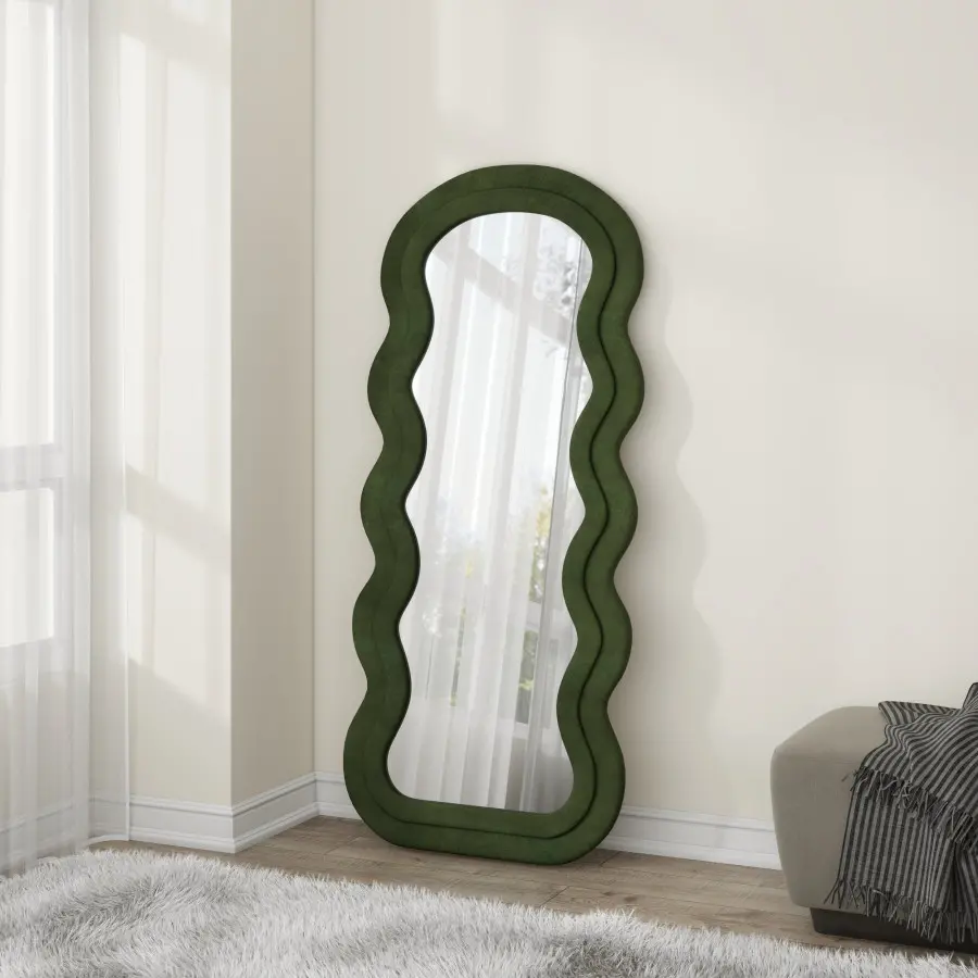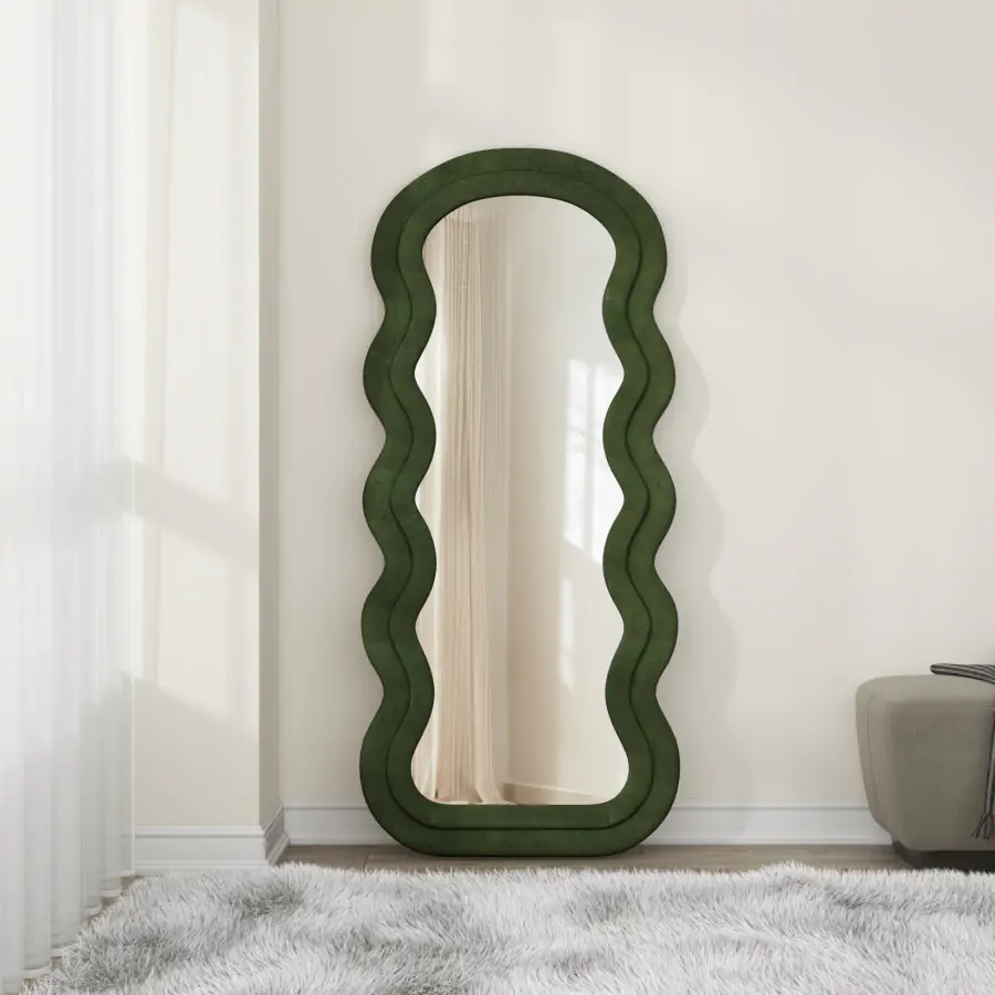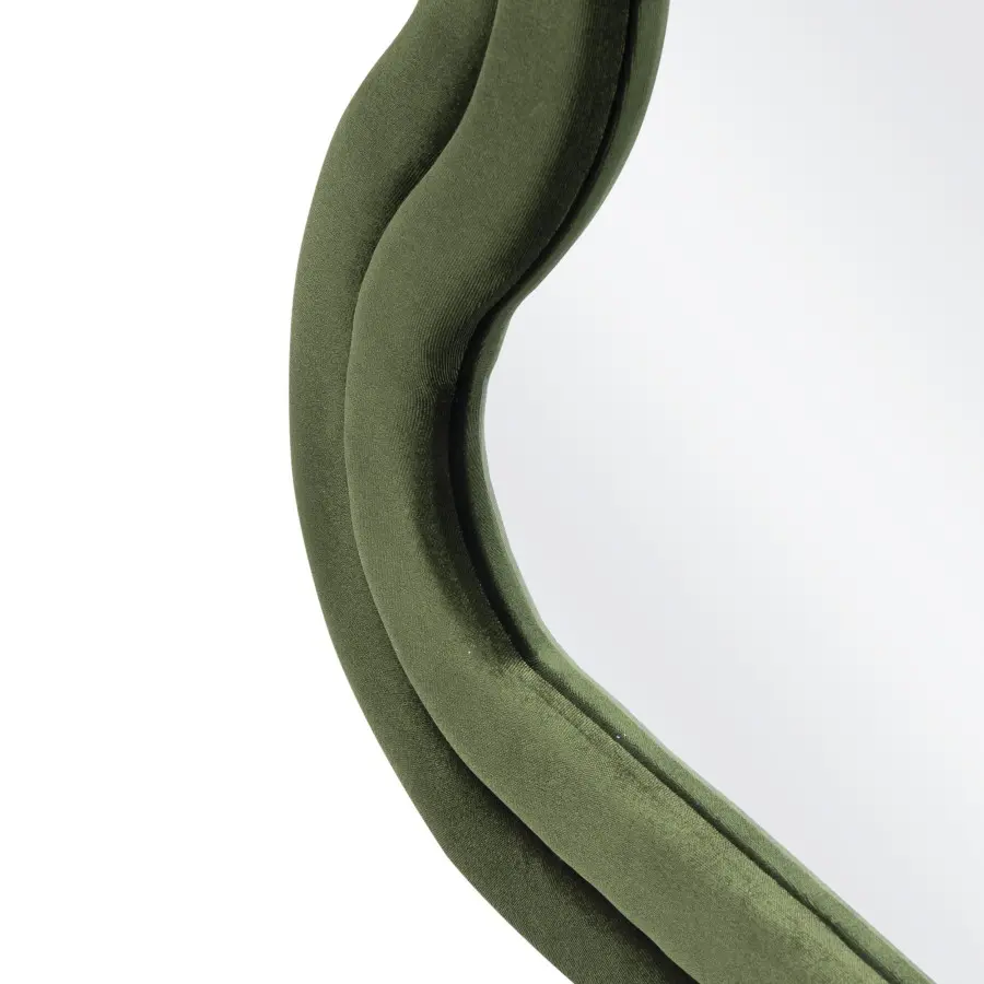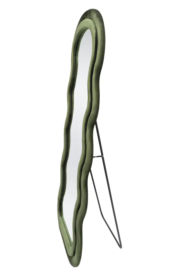 Vlnitý rám s jemně zaoblenými liniemi dodává zrcadlu dekorativní charakter a stává se výrazným prvkem interiéru. Rám je potažen sametovou látkou, konstrukce z MDF zajišťuje stabilitu a dlouhou životnost.