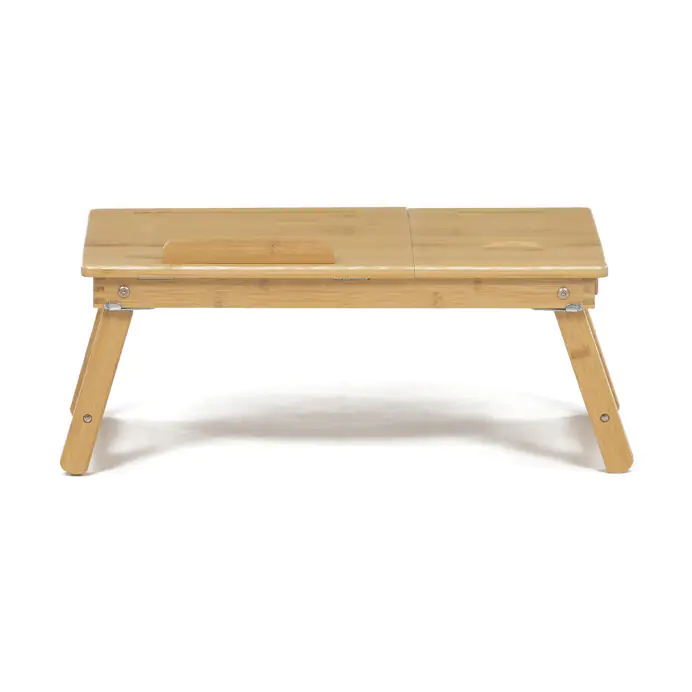 Deska je rozdělena na dvě části, přičemž větší část lze nastavit do různých úhlů pro pohodlné umístění notebooku nebo knihy, zatímco menší část slouží jako pevná plocha s vyfrézovaným otvorem pro hrnek. Pevné nohy z masivního bambusu jsou vybaveny protiskluzovými koncovkami a stolek lze snadno složit pro úsporu místa.