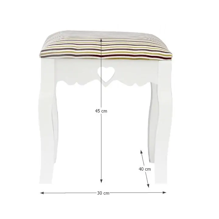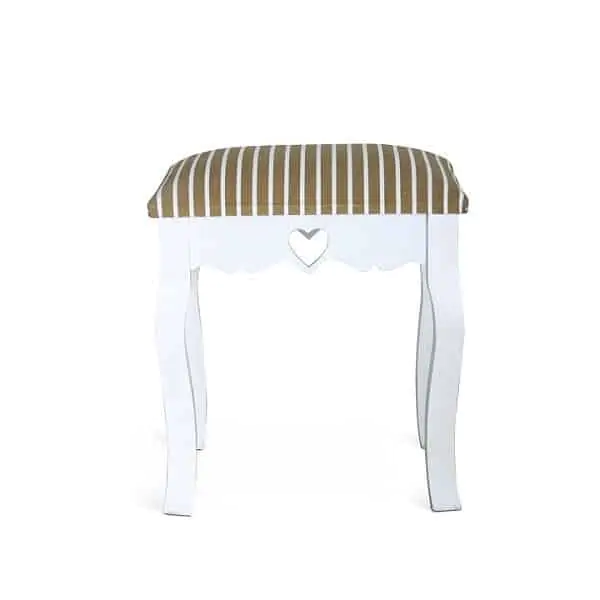 Provedení: Elegantní taburetka z masivního dřeva. S ozdobným výřezem srdíčka. Barva: bílé dřevo, potah sedáku béžovo- bílý proužek. Vintage provedení: Trhlinky, šmouhy či patina tak nejsou...