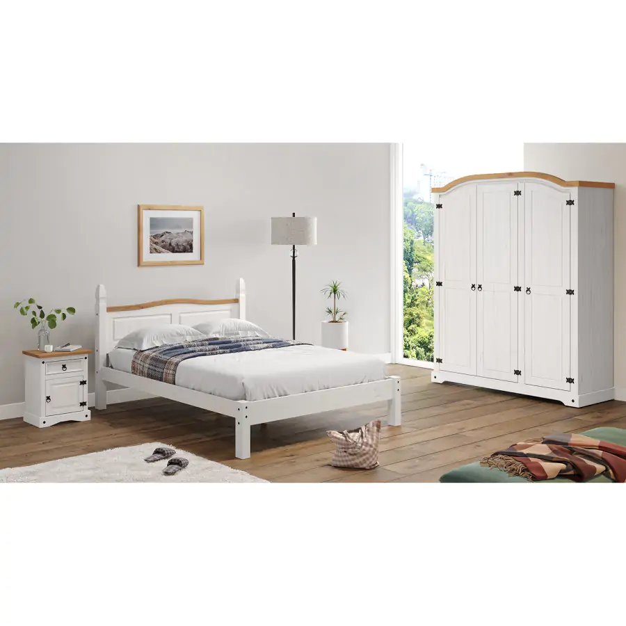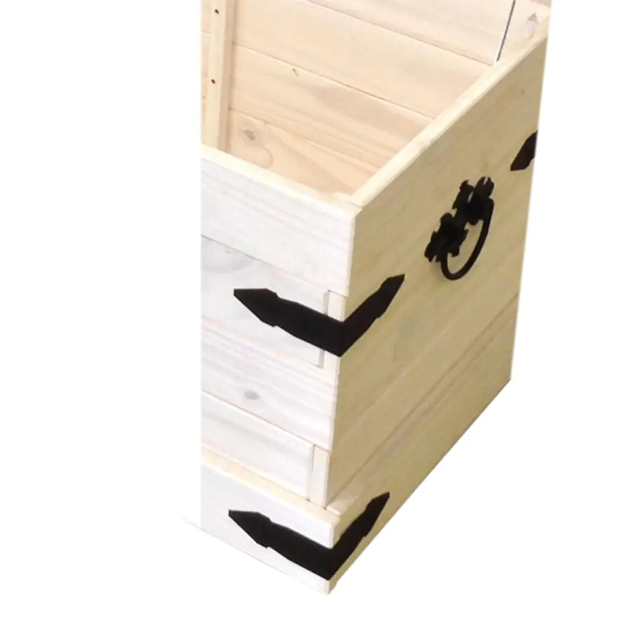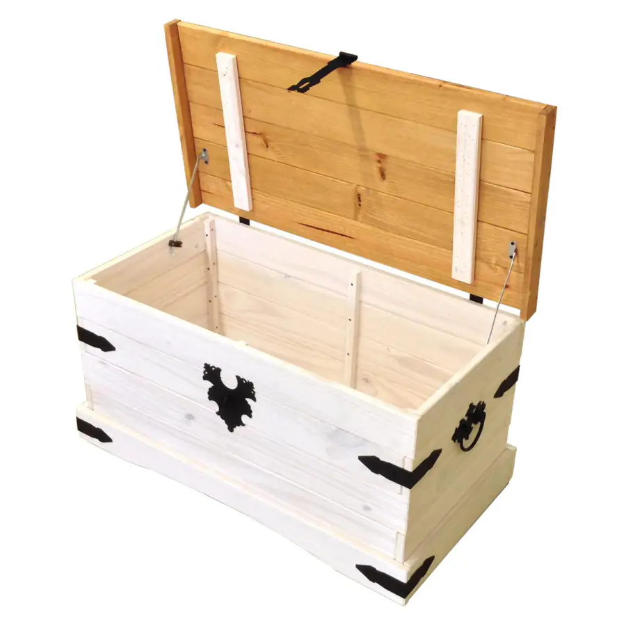 Dřevěná truhla je vyrobena z masivní borovice voskované v bílém odstínu. Horní deska je voskovaná v medovém odstínu. Otevírání zajišťuje kovová petlice s kovovými ozdobnými úchytkami.
