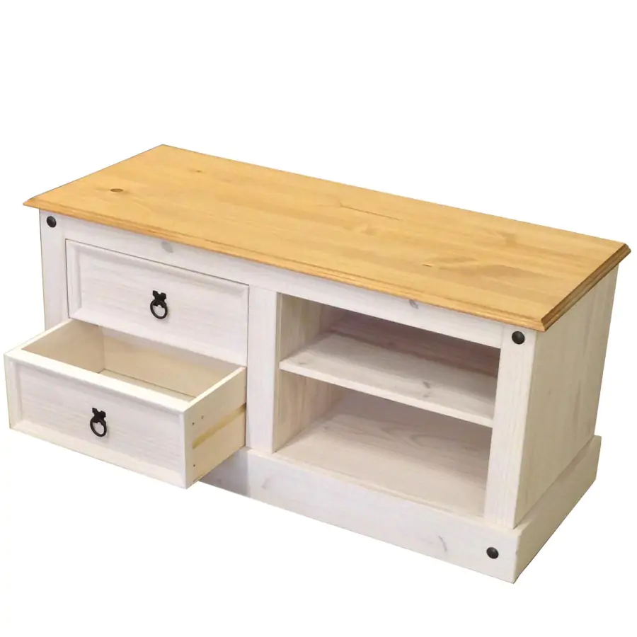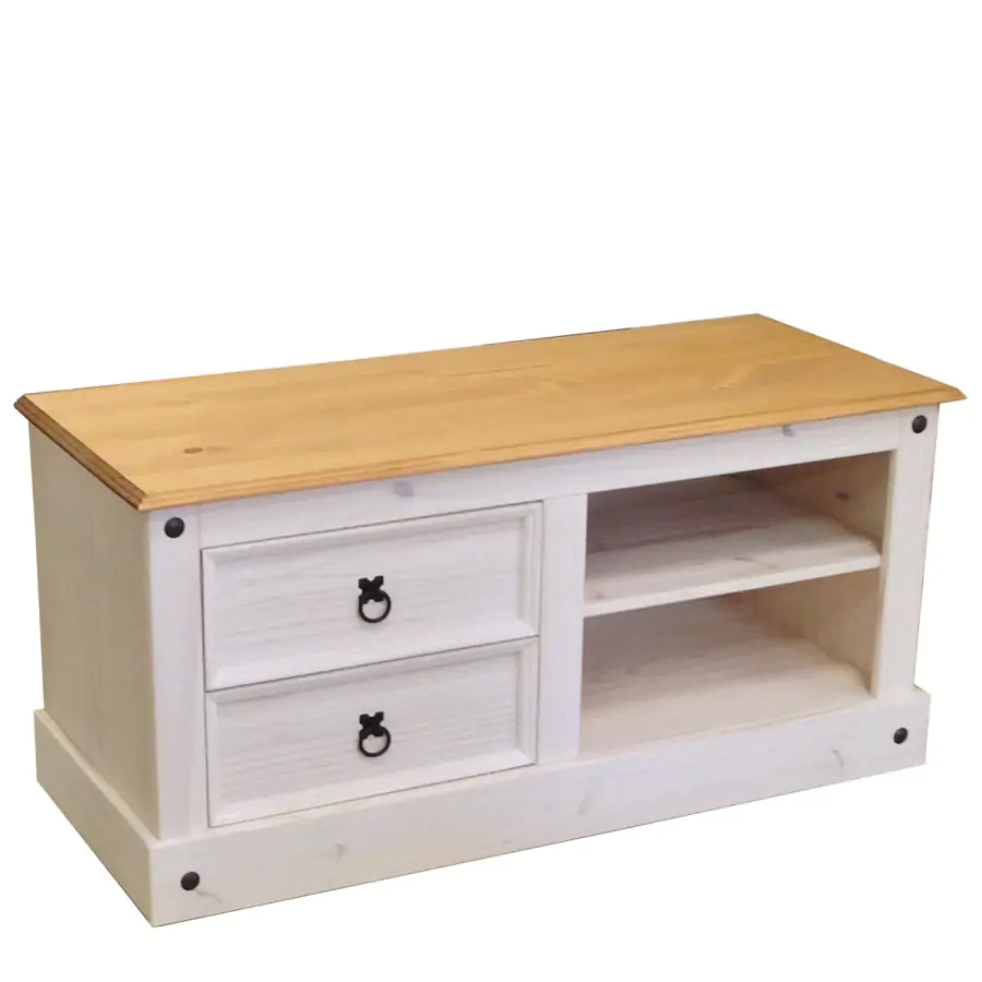 Moderní televizní stolek CORONA je vyroben z masivní borovice voskované do bílého odstínu, horní deska je voskovaná do medového odstínu.