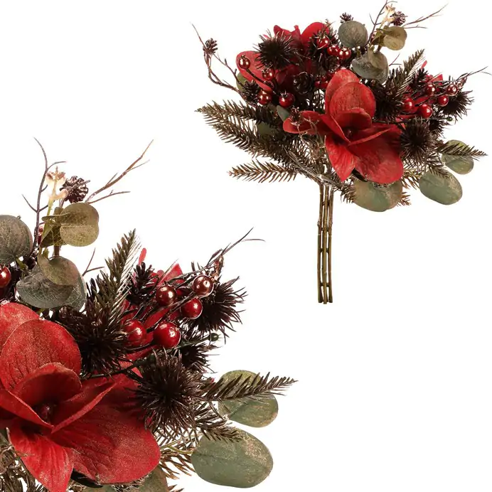 Kombinace nádherných květů, jehličí, bobulí, šišek a lístků vytváří bohatou a harmonickou kompozici, která ozdobí váš interiér po celé svátky i dlouho poté. Stačí ji umístit do vázy a užívat si její krásu rok co rok, bez starostí o opadávání či ztrátu čerstvosti.
