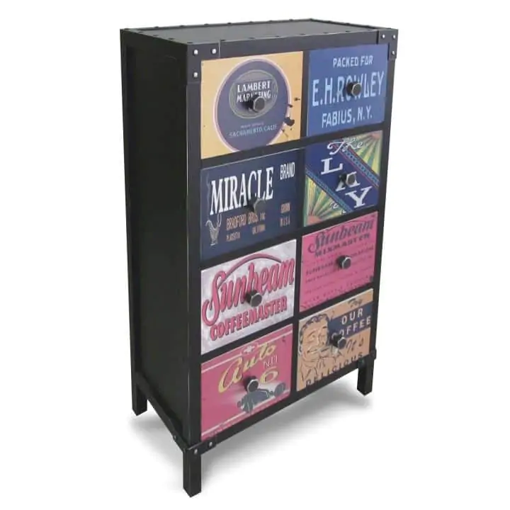 Industriální komoda je vyrobena z MDF a kovu v černé barvě v kombinaci s barevnými retro nápisy.