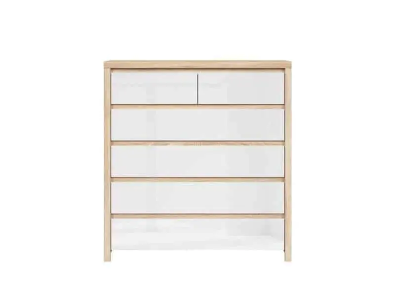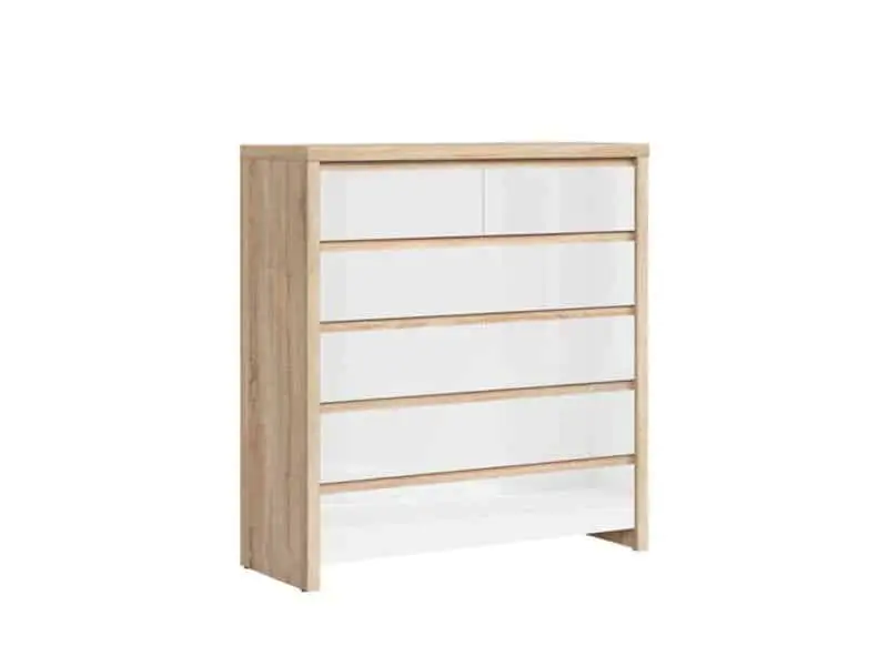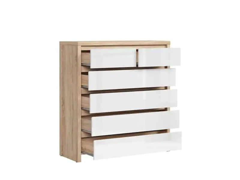 Komoda KOM6S ze systému KASPIAN je zhotovena v barevné kombinaci dub sonoma/bílý lesk.