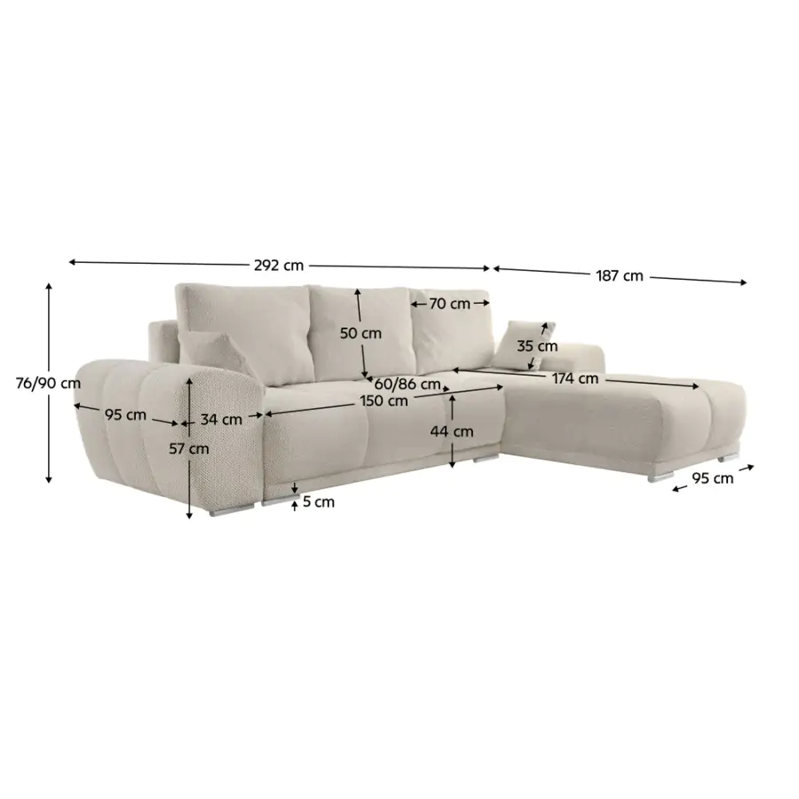 - Rozměry (ŠxHxV): 292x187x76/90 cm