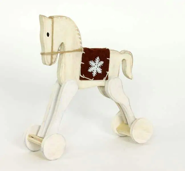 Dřevěný koník na kolečkách vhodný jako vánoční dekorace interiéru.
