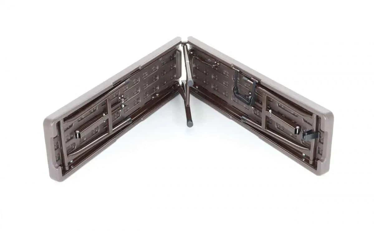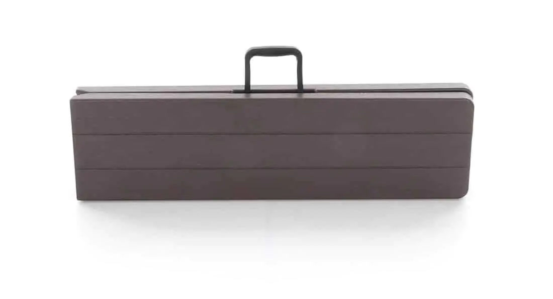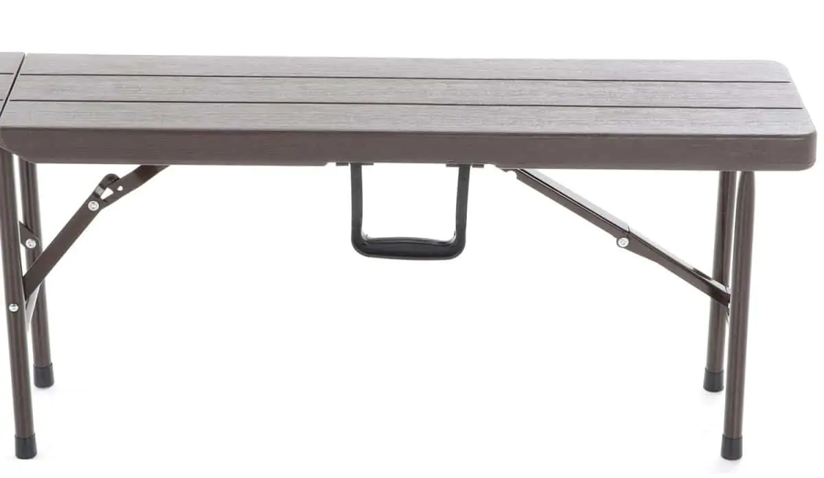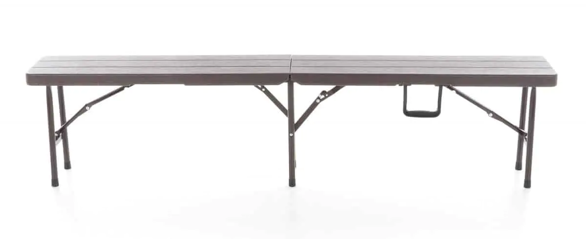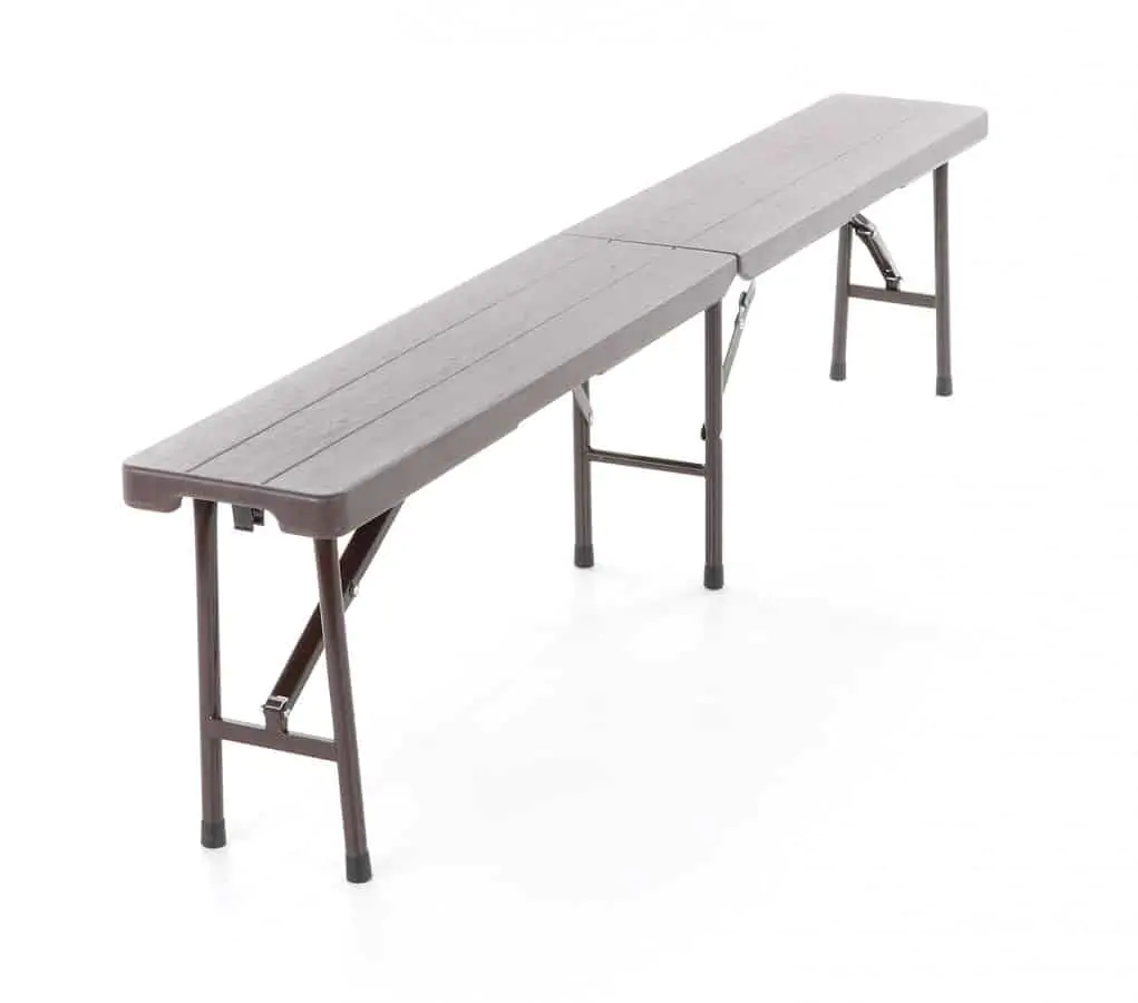Skládací lavice z ocelových profilů, povrchově dokončena komaxitovou barvou, sedák je v imitaci masivního dřeva z lisovaného plastu s UV filtrem.