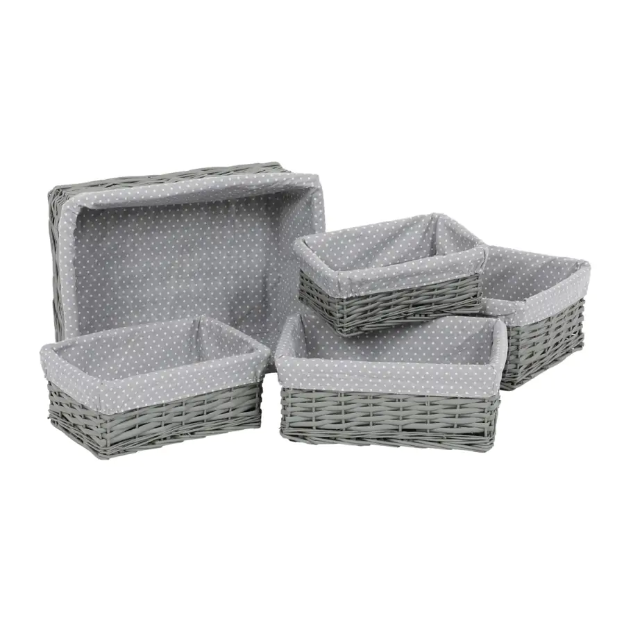 Je v neutrální šedé barvě a k dostání v sadě pěti kusů odlišných rozměrů.