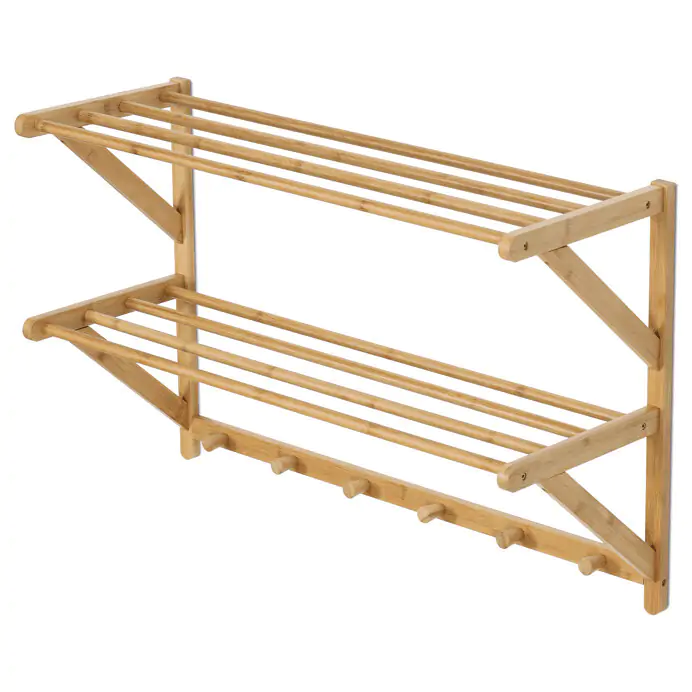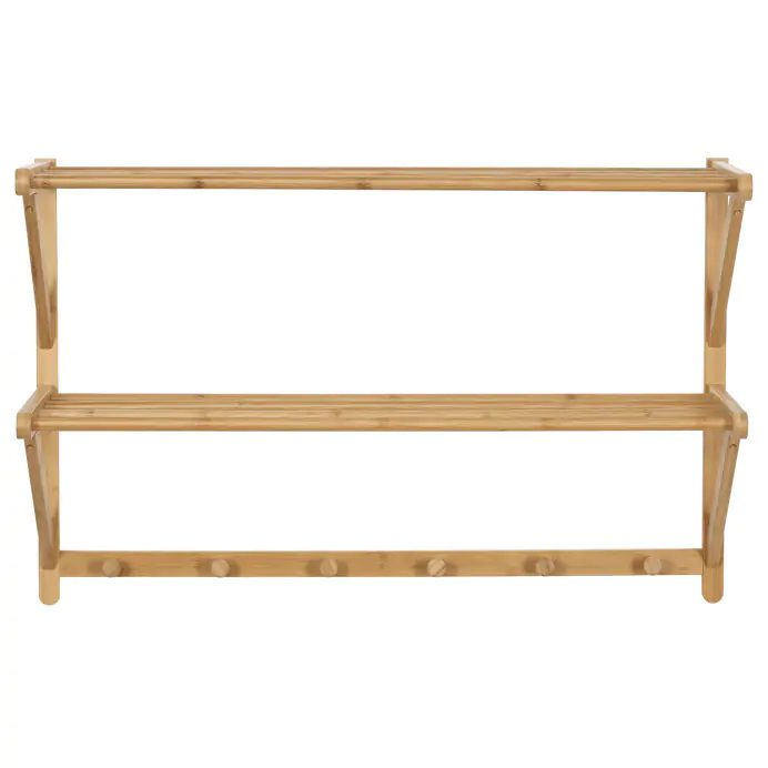 Police nabízí dvě úložné plochy tvořené pevnými tyčemi, které jsou vhodné pro odkládání drobných předmětů či textilu. Spodní část je vybavena šesti kulatými věšáky, které umožňují praktické zavěšení kabátů, klobouků nebo tašek. Díky kvalitnímu zpracování a stabilnímu uchycení na stěnu je police vhodná pro vstupní haly, chodby i ložnice. Přírodní bambus se snadno udržuje a je navržen pro dlouhou životnost.