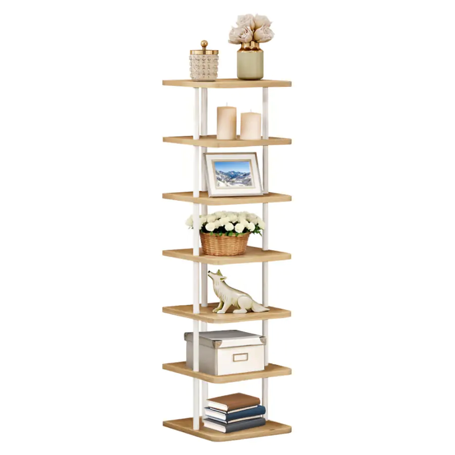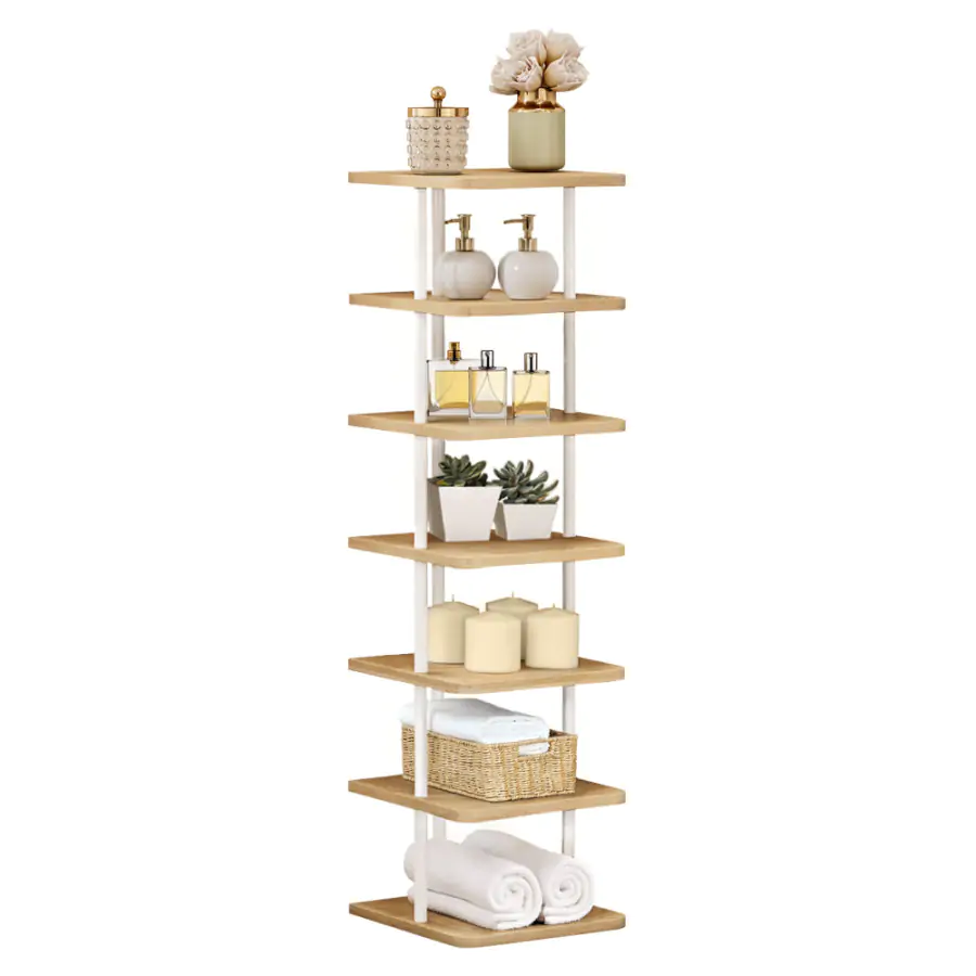 Je vyroben v kombinaci bílého kovu a doplněn o police z dřevotřísky v provedení světlý dub, přičemž poskytuje dostatek úložného prostoru na různé předměty.
