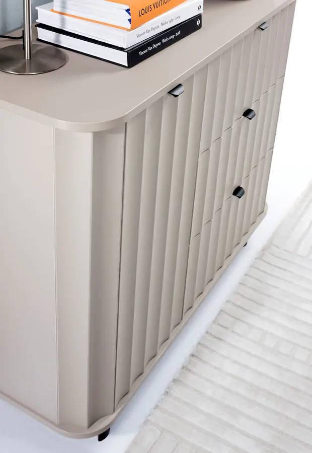 Kolekce nábytku JOLY do obývacího pokoje, která spojuje eleganci a funkčnost. Jejím charakteristickým prvkem jsou frézované, fóliované čelní desky z MDF, které dodávají interiéru jedinečný charakter. Díky netradiční barvě se hodí do různých stylů zařízení, od moderních po minimalistické.