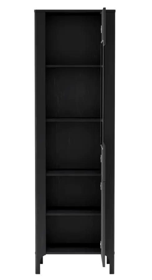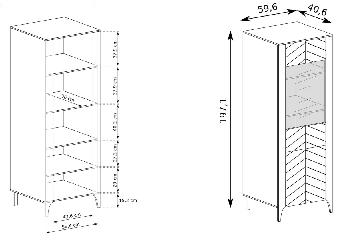 Vitrínu podepírají štíhlé nožky MDF o výšce 15 cm, které zajišťují nejen stabilitu, ale i lehkost vzhledu a snadnější úklid pod nábytkem. Odolné laminované desky s ABS hranami navíc přispívají k dlouhé životnosti.