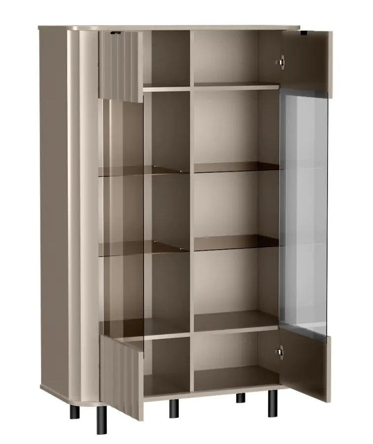 Vitrínu podepírají štíhlé kovové ocelové nožky práškově lakované o výšce 12 cm, které zajišťují nejen stabilitu, ale i lehkost vzhledu a snadnější úklid pod nábytkem. Jsou to kusy nábytku, které se nestylizují násilně, ale spíše podtrhují charakter prostoru.
