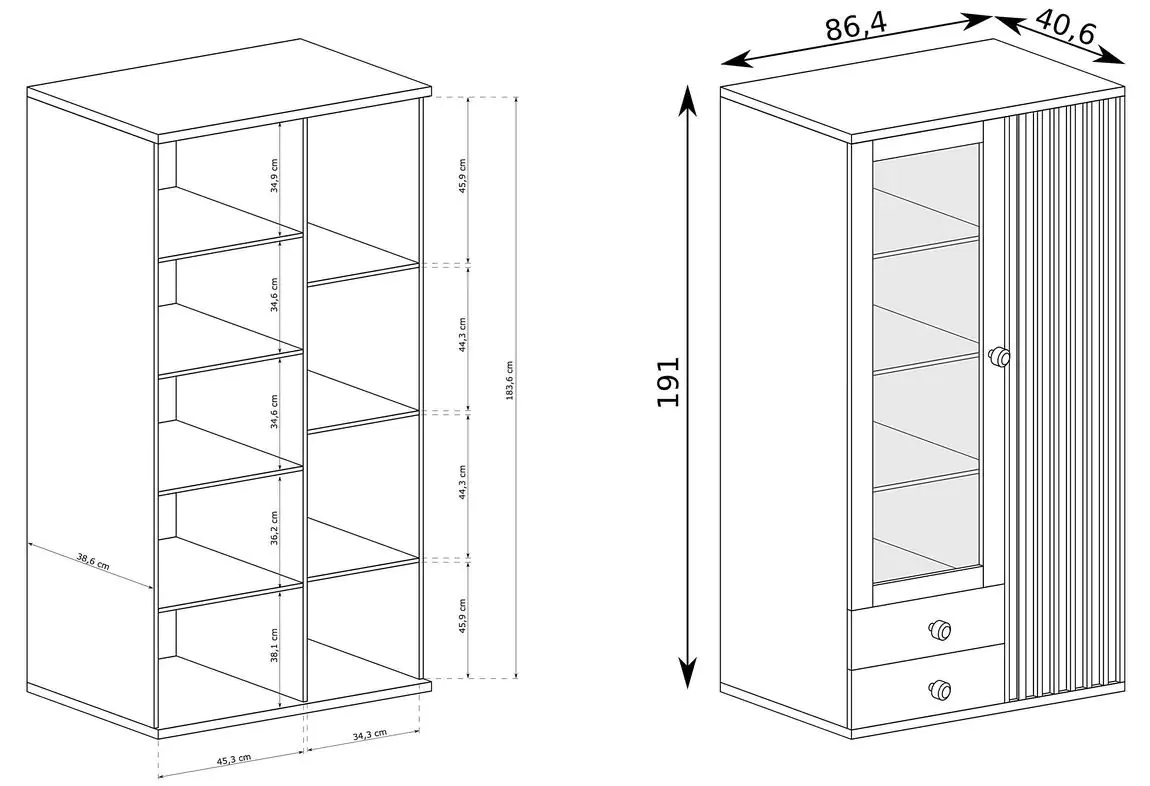 Vitrína dvoudveřová CALI se dvěma zásuvkami s netradičním provedením detailu dvířek s lamelami.
